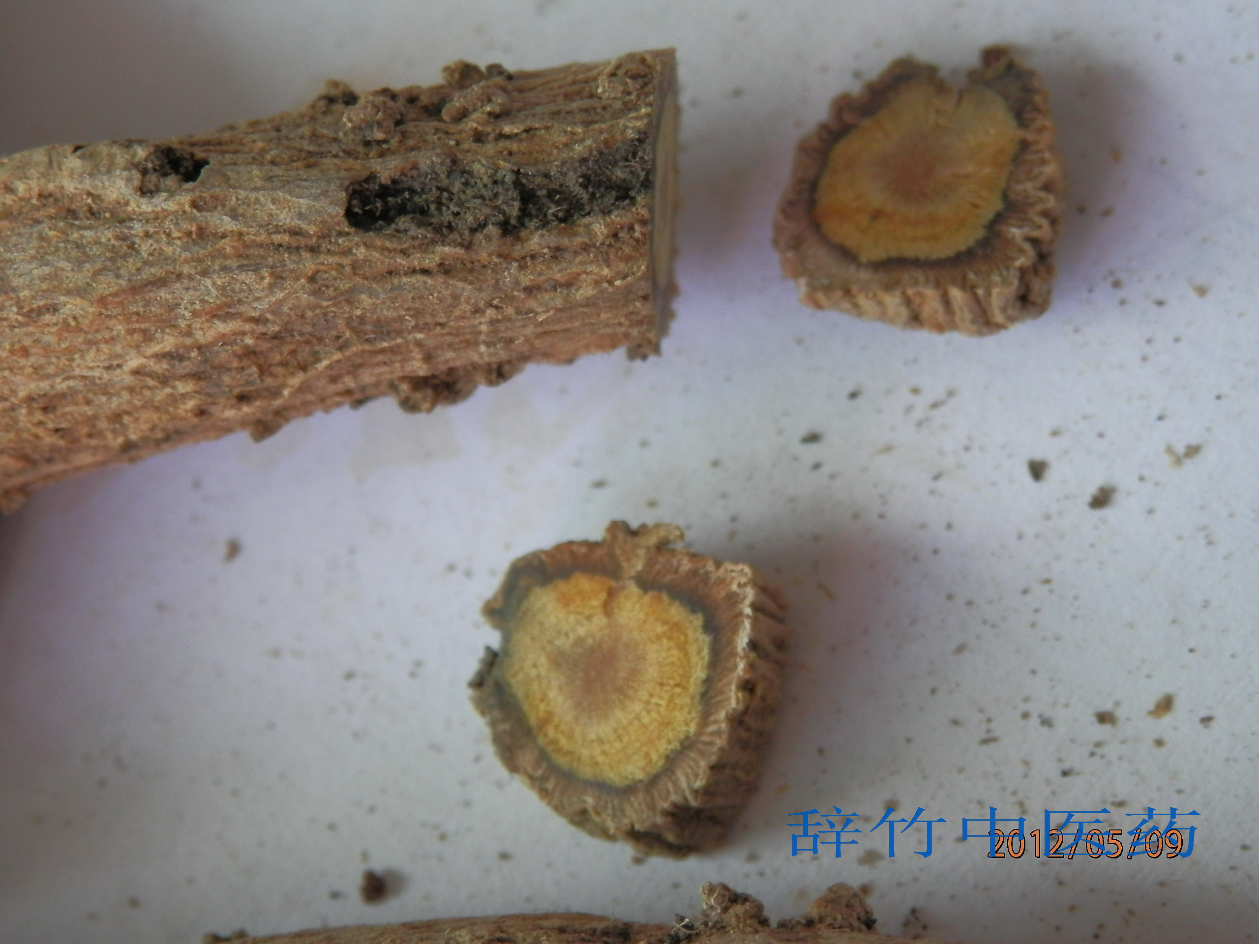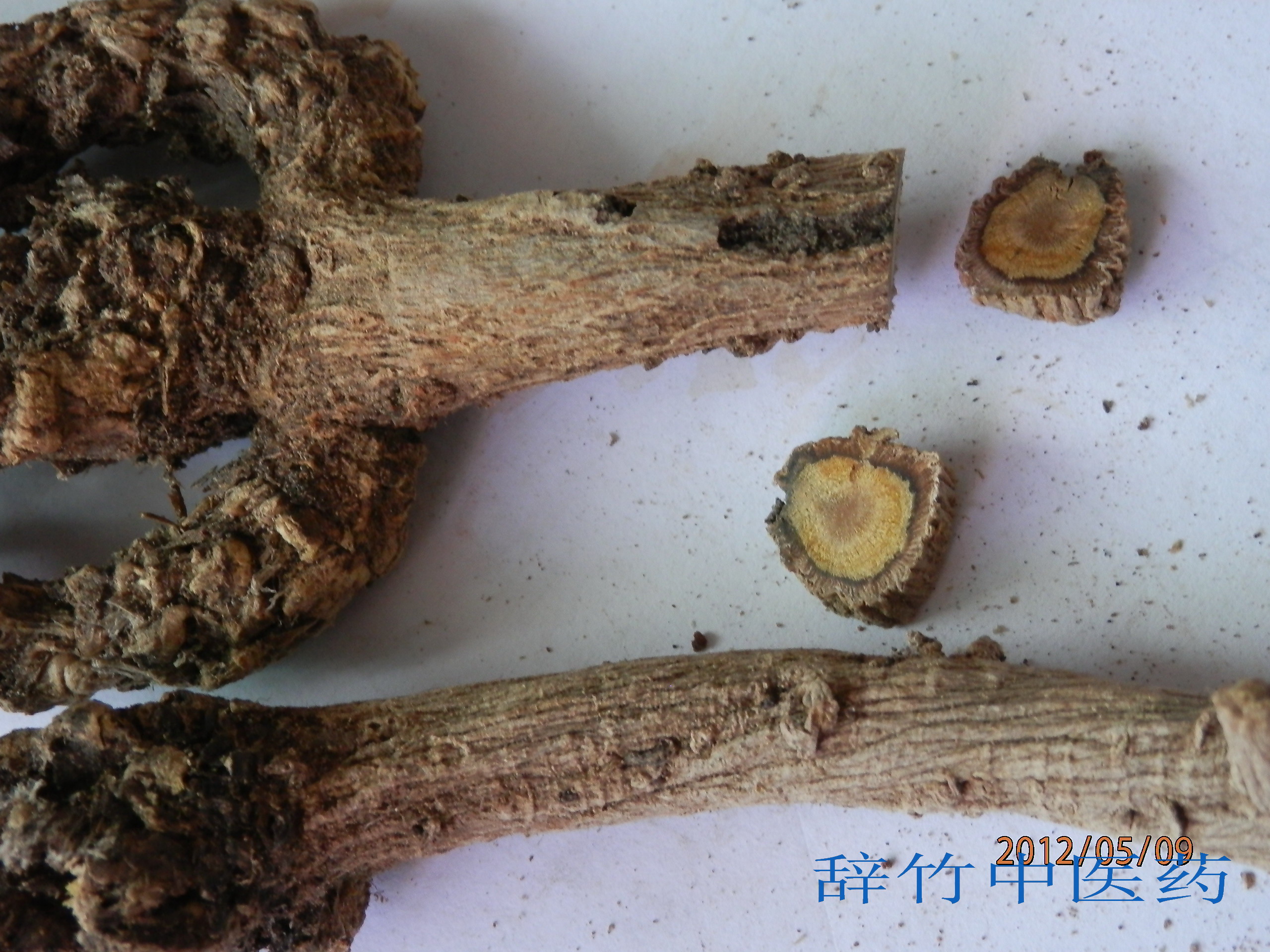 体实,质略软,易折断,断面皮部黄白色,木部黄色。