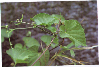 形态 藤状草本。含乳状汁液。茎有柔毛。単叶对生,宽卵形或卵状长圆形,基部心形 。花白色,,5数,为腋生聚伞花序伞房状;花序梗长达10cm;副花冠成杯状。 果双生,披针形,长8cm, 直径1cm。种毛白色。