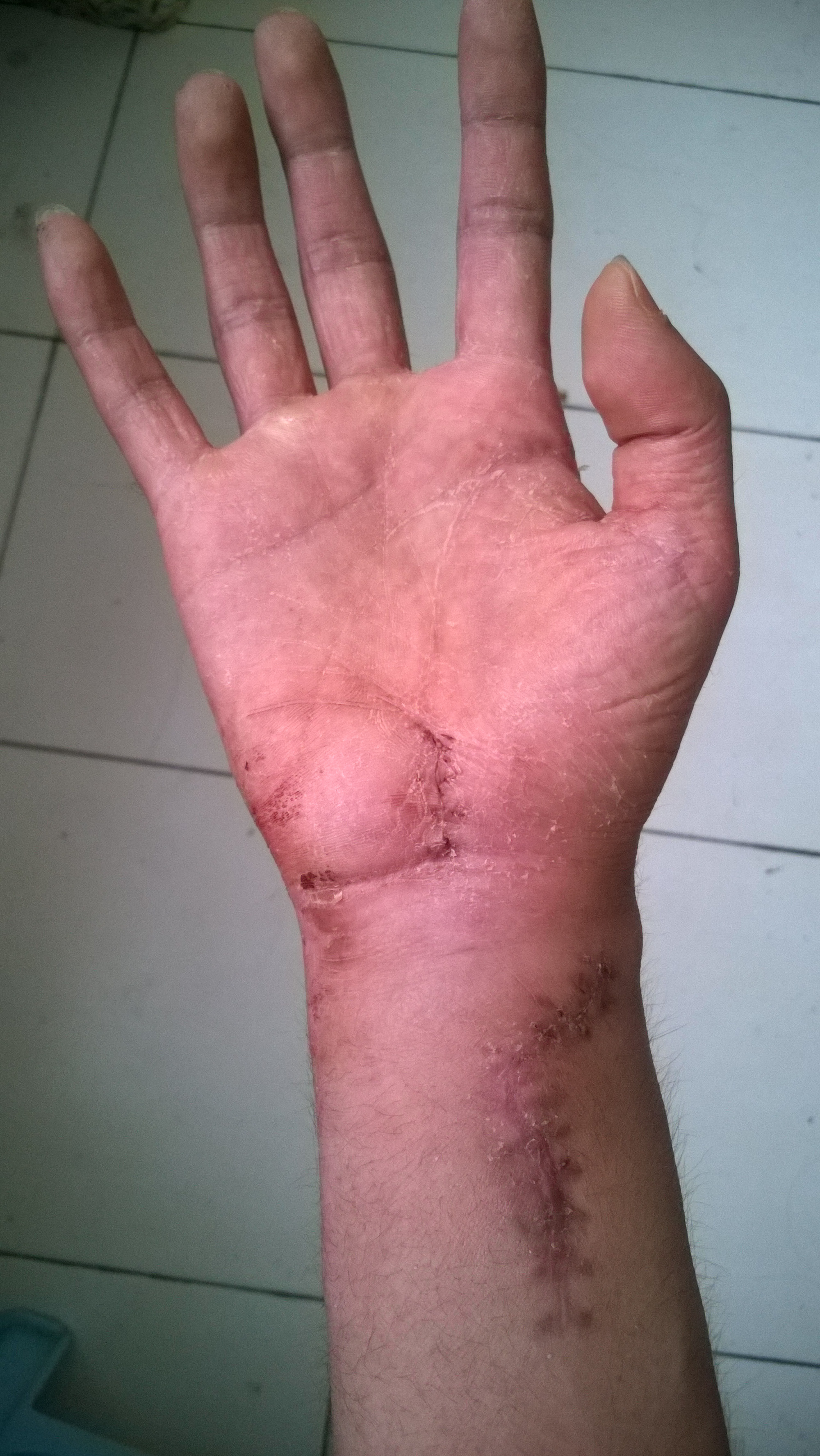 2015年5月16日 手腕玻璃割伤 拇长屈肌腱在手腕处断裂 桡侧屈腕肌腱断裂