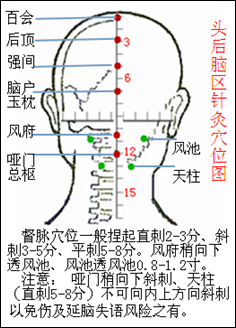 风府穴:(位于脑后督脉,发际直上1寸处,针尖不可向上,以免刺入枕骨大孔,误伤延髓,切压按摩亦可 )针尖微下横斜透刺风池穴0.5-1寸。