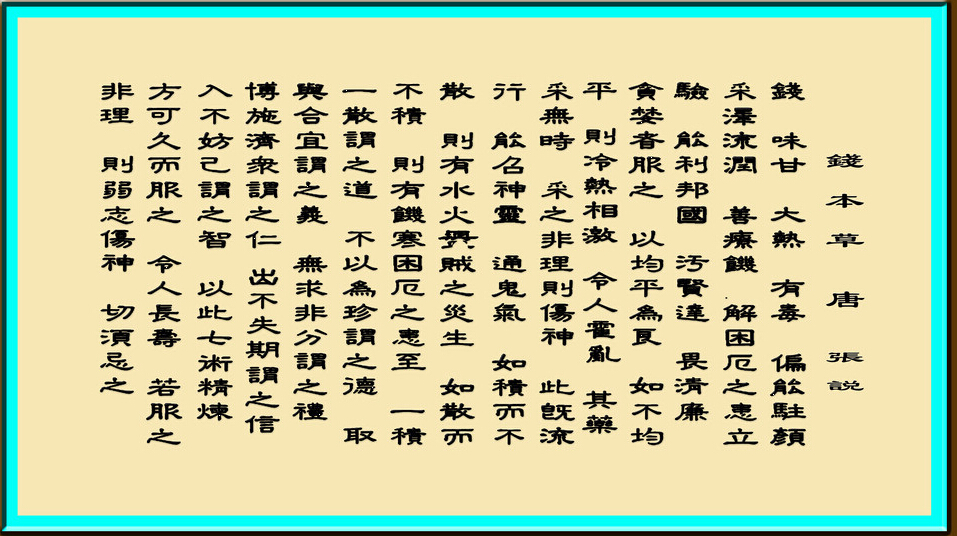 《钱本草》 唐·张说 “钱,味甘,大热,有毒。偏能驻颜采泽流润,善疗饥寒,解困厄之患立验。能利邦国、污贤达、畏清廉。贪者服之,以均平为良;如不均平,则冷热相激,令人霍乱。其药,采无时,采之非理则伤神。此既流行,能召神灵,通鬼气。如积而不散,则有水火盗贼之灾生;如散而不积,则有饥寒困厄之患至。一积一散谓之道,不以为珍谓之德,取与合宜谓之义,无求非分谓之礼,博施济众谓之仁,出不失期谓之信,入不妨己谓之智。以此七术精炼,方可久而服之,令人长寿。若服之非理,则弱志伤神,切须忌之”。
