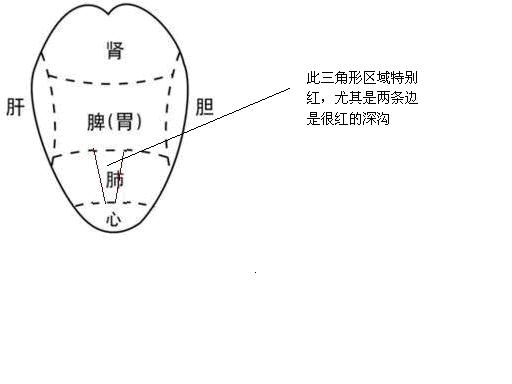 症状:右鼻甲红肿,右侧头部有一股多余的滞气导致血管很涨。便秘。梦多如云。舌象整体看起来正常,会随所吃的食物等变化,但是有一点是不会变的:有一个红色的三角区域(请见附图)。吃了补气的食物会加重病情,导致胸闷。得此病后不感冒了。