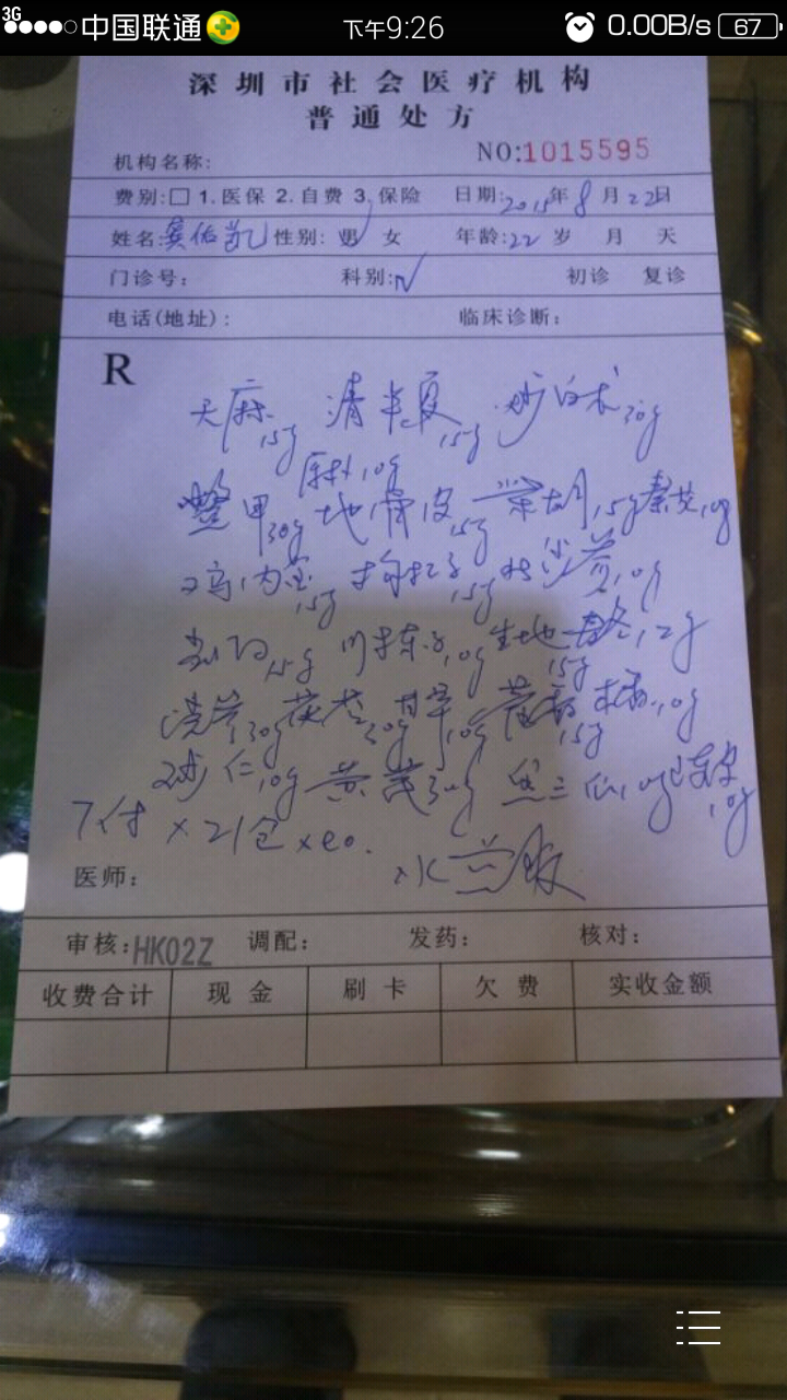 然后我前往深圳寻求中医诊治!本人挺看好中医中药的,以前阑尾炎没开刀,后年年复发,自己找了个慢性阑尾炎的药方,吃了,至今两年未发作!