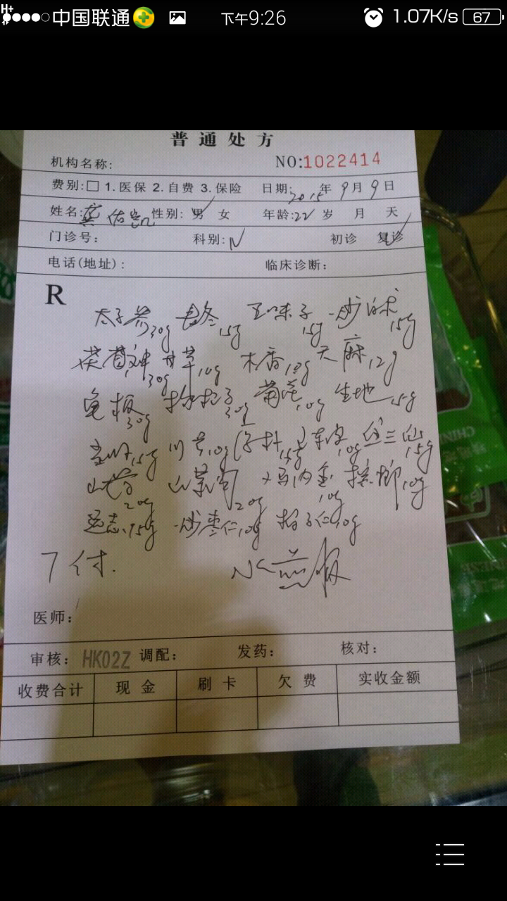 然后开了一大推药,四十几一副,他们煎好打包给我,我开了七服药,吃后有所效果,症状减轻!