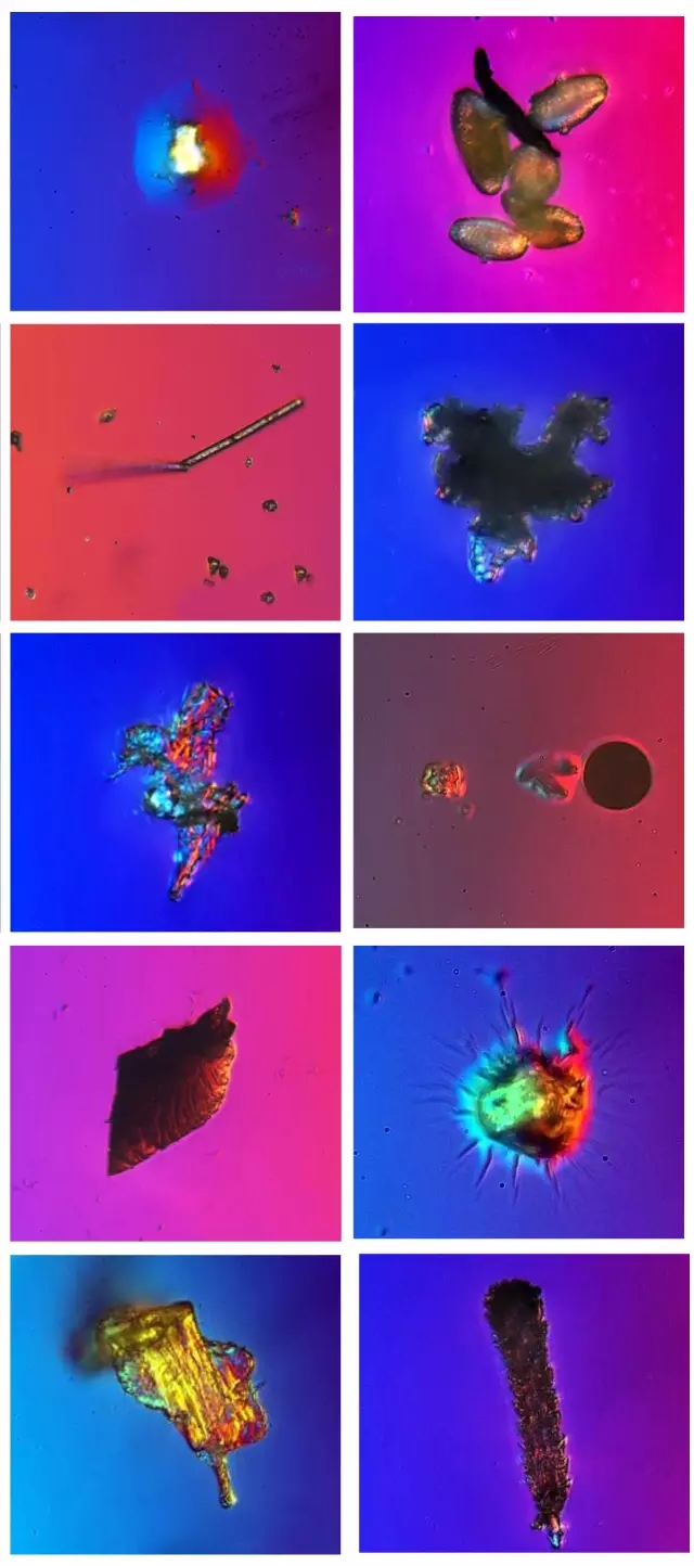 网友通过通过显微镜,将霾颗粒放大1000倍后,发现他们形状各异,有复合体,有生物颗粒,有矿物质的,看上去触目惊心。