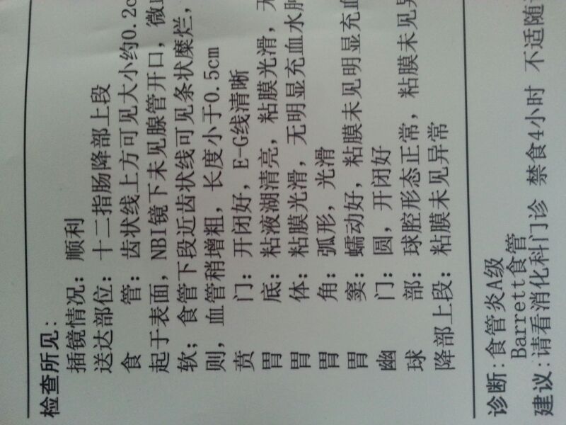我的检查单是这样写的,食管炎A级,巴洛氏食管。病理检查单结论是符合巴洛氏。