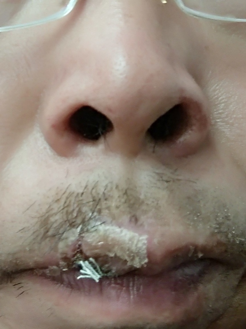 4天前(11月4日晚)又发生事故了,喝了点酒,觉得没喝多,但是电车走路时倒了下,栽车把上了,一个牙齿磕晃了,这个牙齿把嘴唇隔破了。去医院医生说要缝几针,但是我说我是疤痕体质,缝了就要留疤,没让缝,医生就给固定上了。原以为不缝自己长上去不会留疤,今天去找那个医生,医生说缝不缝都会留疤,不缝留的疤痕更大。现在伤口还没长好,还包着,医生让我三天后再去看看情况,能长好的话就这样,长不好的话再在外面缝两针,最好是能留一个线的疤。