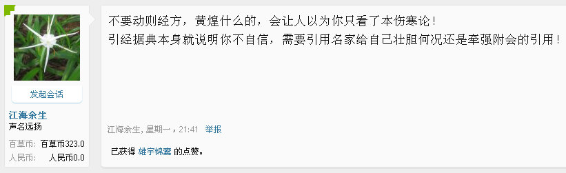 江海老师,我的一点点中医知识,是靠“吃百家饭”得来的,单凭我自己,是琢磨不到也推理不出这些实用经验来的。不要动则经方,黄煌什么的,会让人以为你只看了本伤寒论!