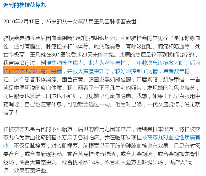 肺梗塞是肺栓塞后因血流阻断导致的肺组织坏死。引起肺栓塞的常见栓子是深静脉血栓,还可有脂肪、肿瘤栓子和气体等。此病起病急,有呼吸困难、胸痛和咯血等,死亡率极高。王凡就在301医院昏迷23天未能幸免。此病的急症是轮不到我们治疗的,我曾经治疗过一例慢性肺栓塞病人。此人为老年男性,一年数次急诊抢救入院,后用桂枝茯苓丸加川芎、丹参,并服大黄䗪虫丸等,较好地控制了病情,患者数年稳定。这个患者形体消瘦、面色青黄、眼圈发黑如熊猫眼,口唇紫暗,肌肤甲错,一看就是中医所说的瘀血体质。我上网看了一下王凡生前的照片,发现她的脸色也偏黄,而且眼圈也发暗,口唇也不鲜红,可见她早有瘀血隐患。我想,如果王凡早点服用中药调理,自己也注意休息,可能就会逃过一劫。但为时已晚,一代女篮骁将,说走就走了!