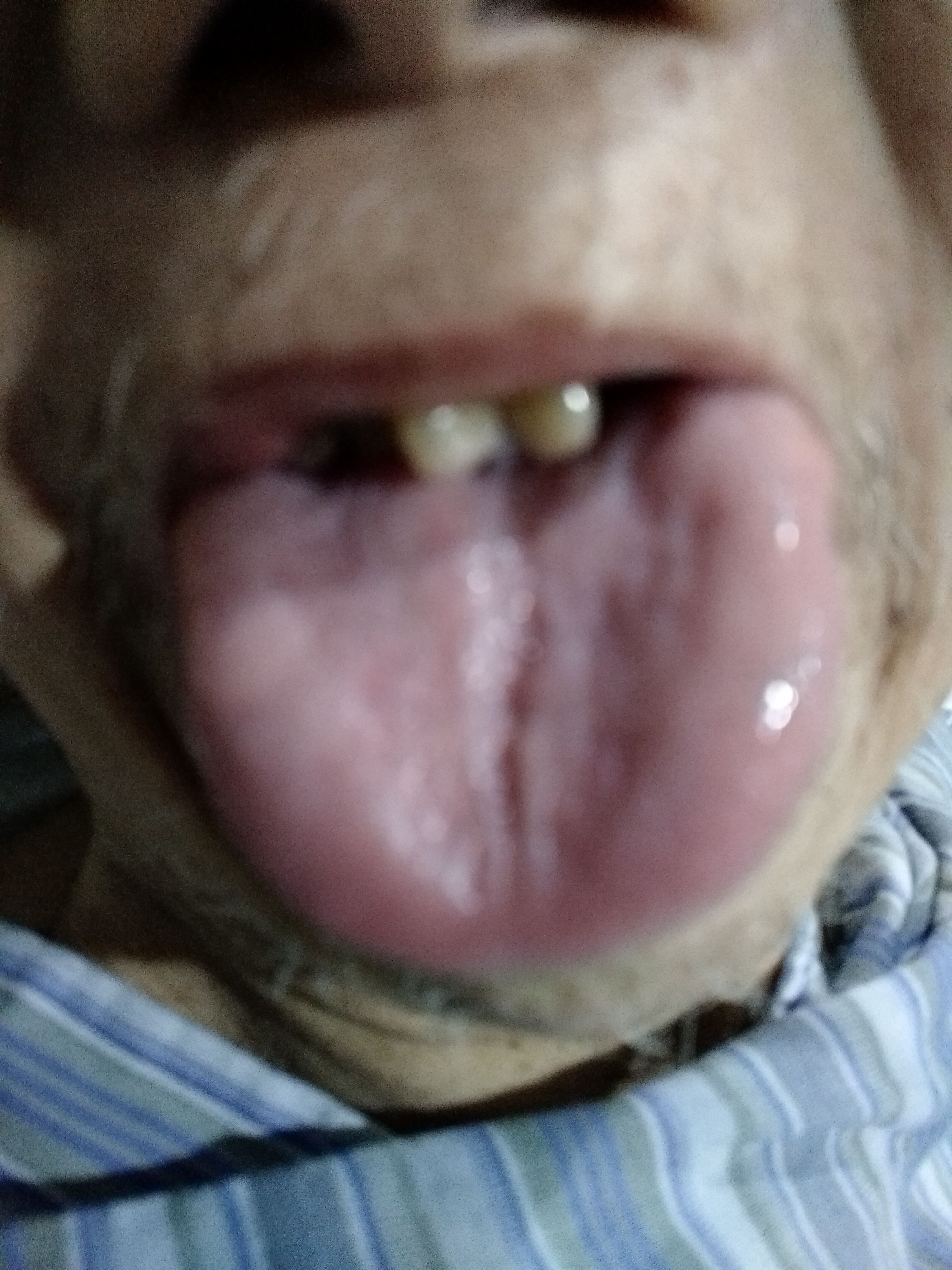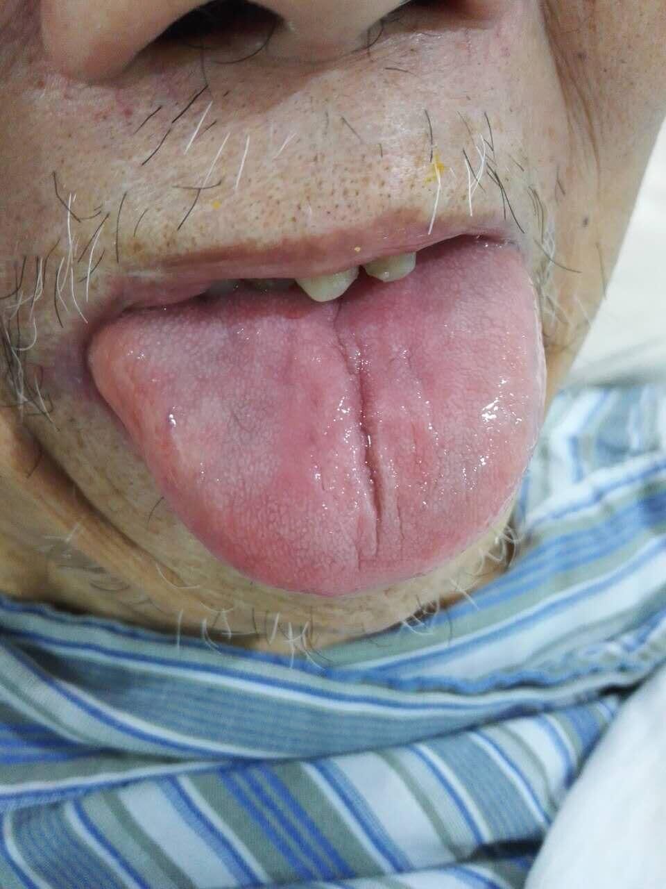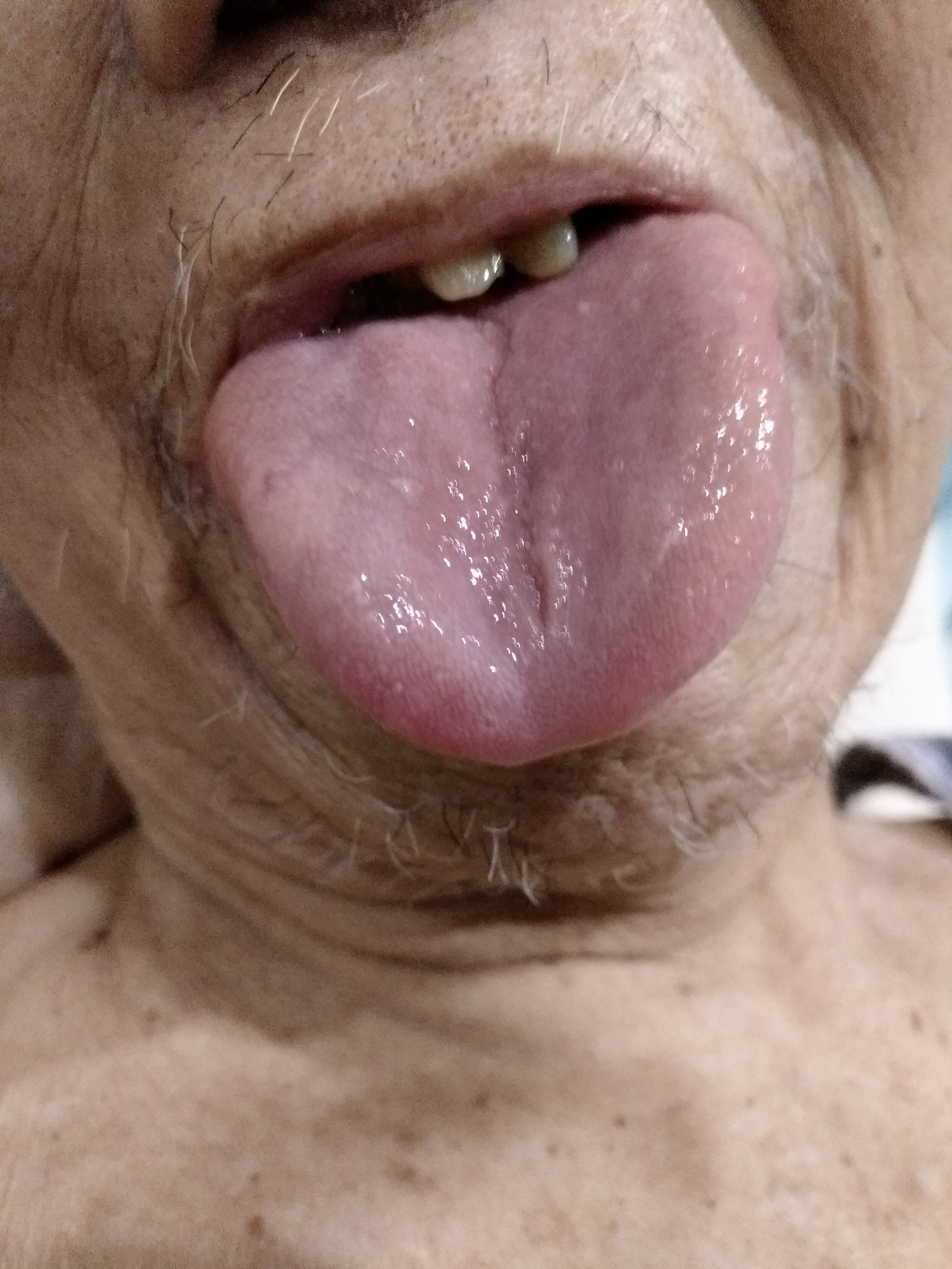 从舌苔上看出原先的熊熊烈火灭的差不多了,有点水滑,痰湿?总之感觉老人没有简单的阴虚阳虚,就算是阴虚体质也必定是阴虚为主夹杂阳虚。总之老人气血阴阳虚实夹杂,比如这次熊熊胃火被扑下去,就显得阳气有点不足,但是如果此时来补阳为主那没几天红红的舌头就有回来了,如果一味滋阴则厚腻的舌苔就会出现。至于裂纹,目前明显就是中间一条,前几天是竖立状不规树状