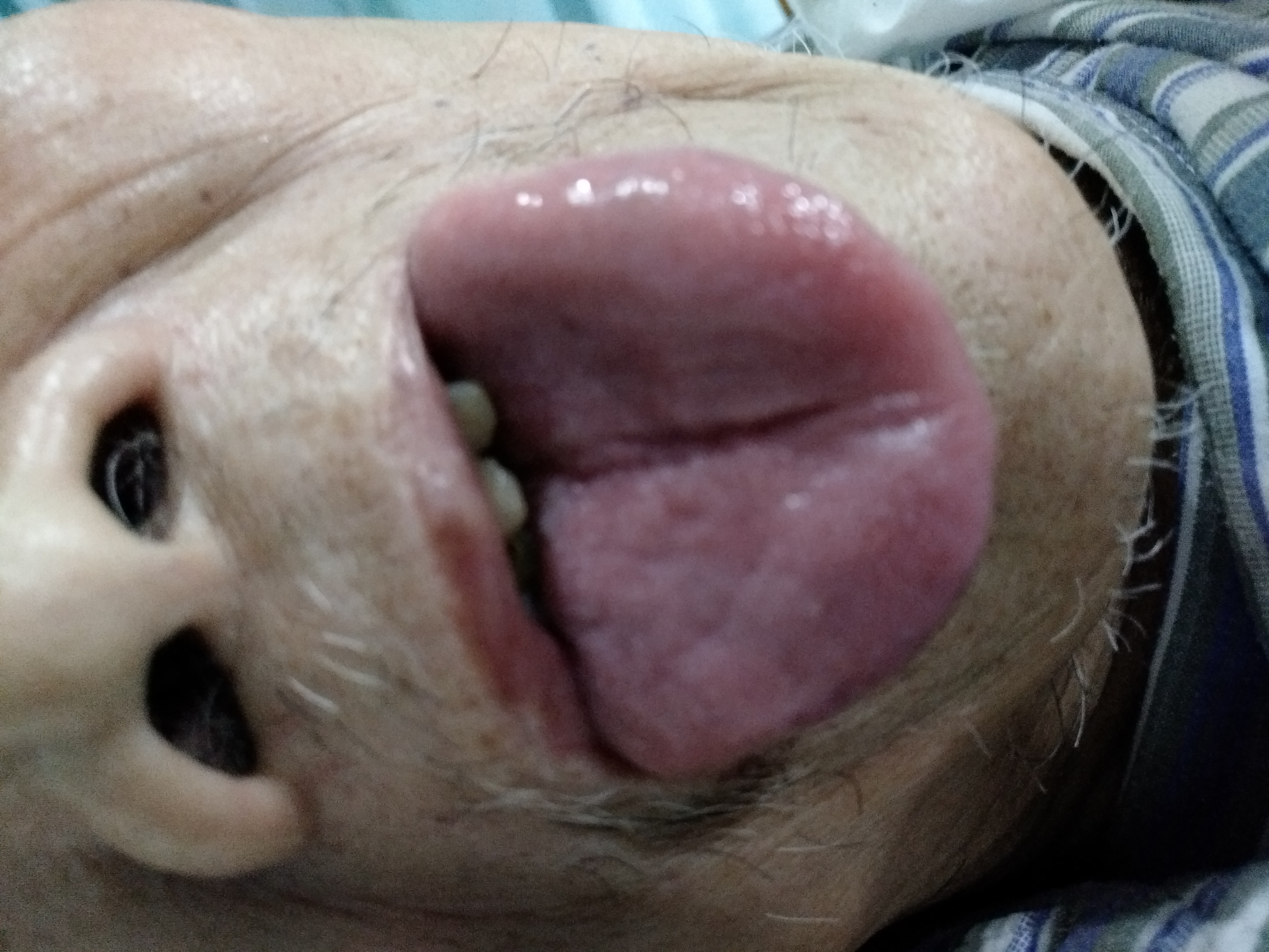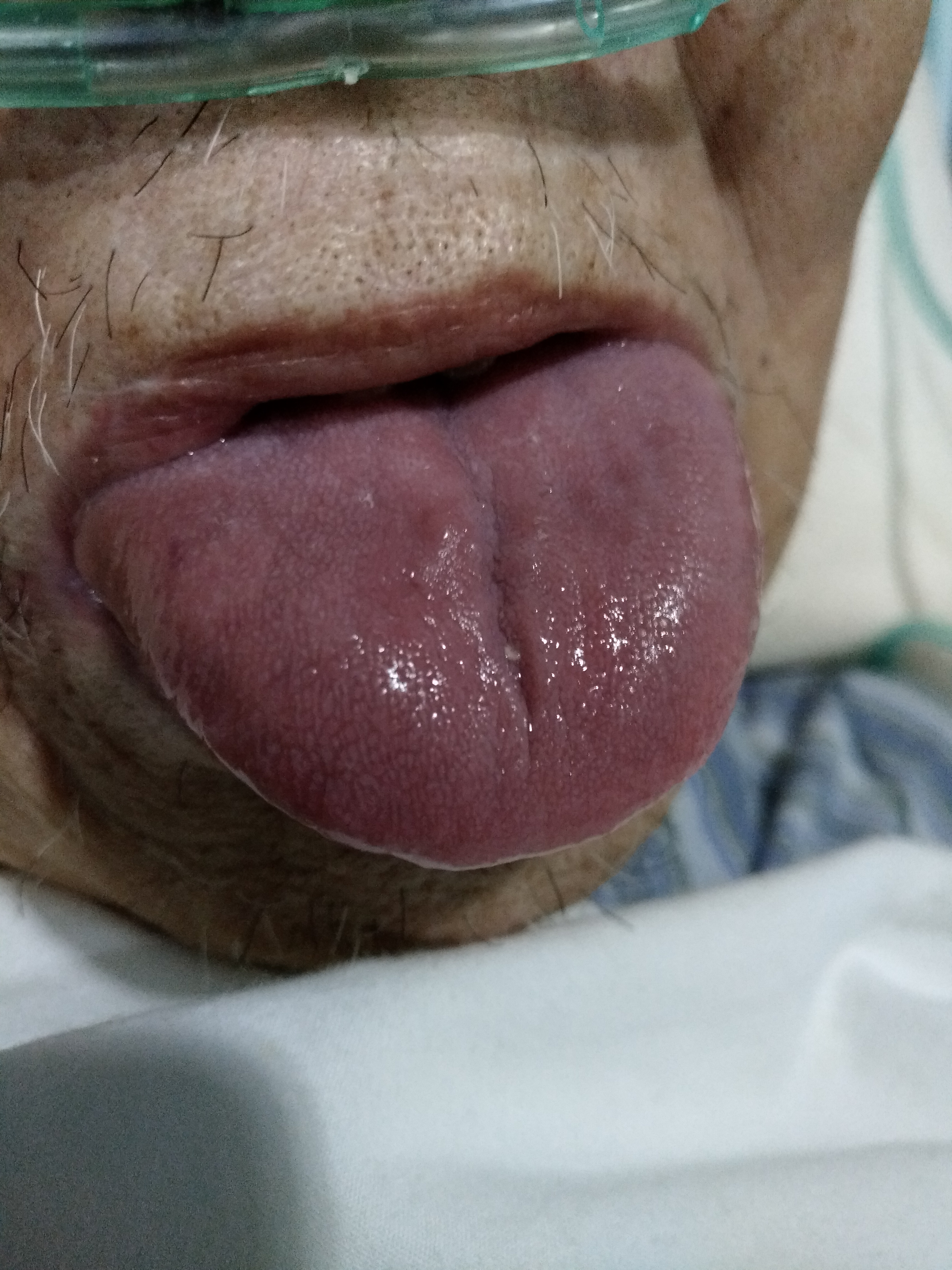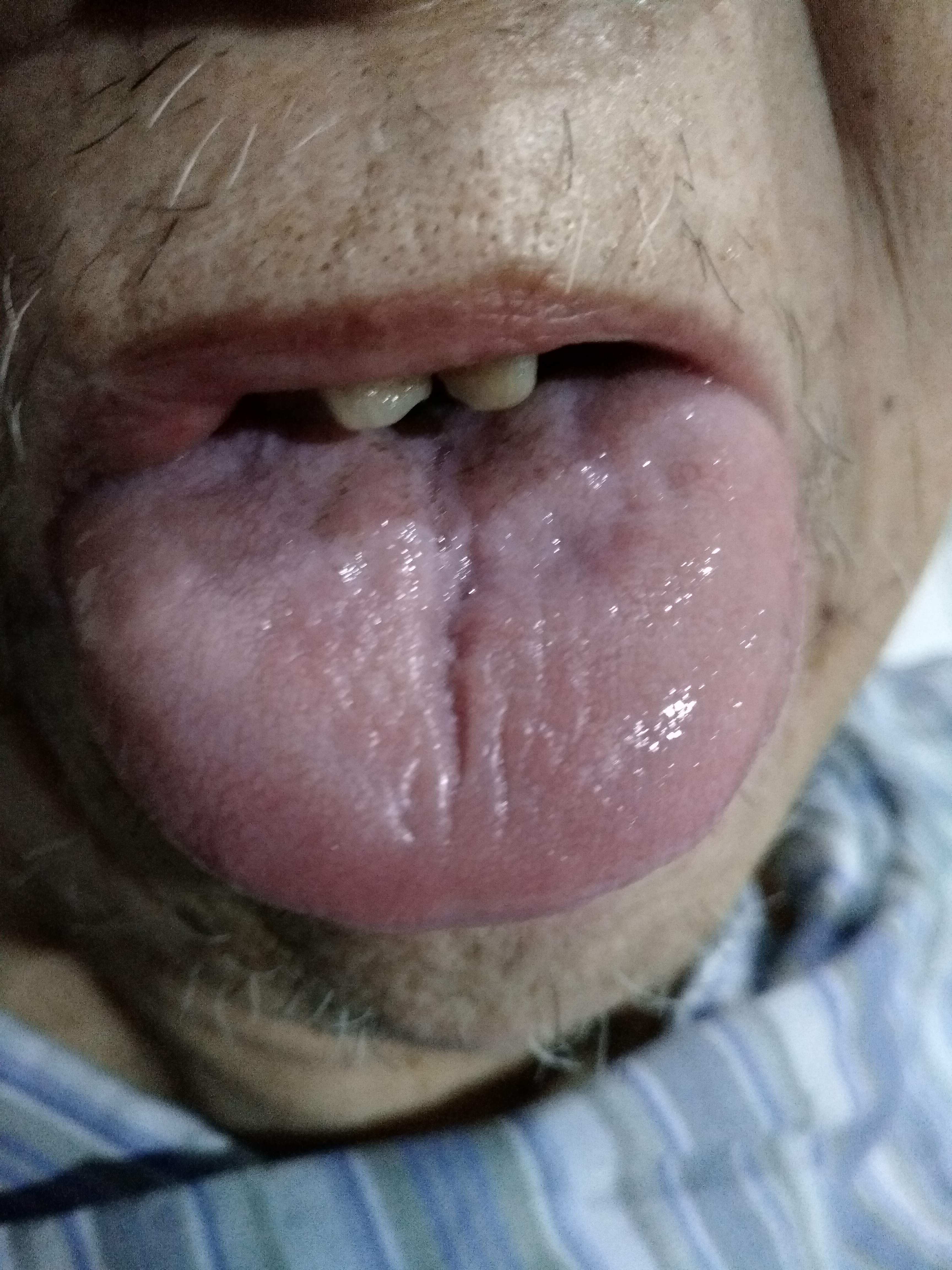从舌苔上看出原先的熊熊烈火灭的差不多了,有点水滑,痰湿?总之感觉老人没有简单的阴虚阳虚,就算是阴虚体质也必定是阴虚为主夹杂阳虚。总之老人气血阴阳虚实夹杂,比如这次熊熊胃火被扑下去,就显得阳气有点不足,但是如果此时来补阳为主那没几天红红的舌头就有回来了,如果一味滋阴则厚腻的舌苔就会出现。至于裂纹,目前明显就是中间一条,前几天是竖立状不规树状