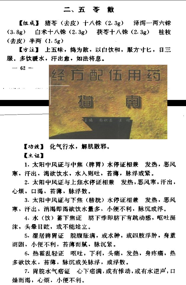 【方解】集猪苓、泽泻、白术、茯苓诸利尿药,合以解外降冲气的桂枝,故治脉浮有热、气冲水逆、渴而小便不利者。