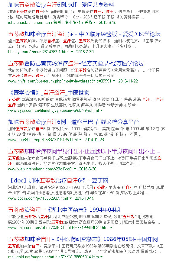 [五苓散]用于治疗自汗、盗汗、半身出汗的医案,网上可以查到不少: