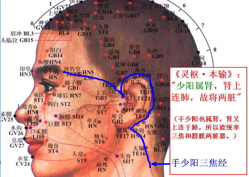 《灵枢·本输》:"少阳属肾,肾上连肺,故将两脏"(手少阳也属肾,肾又上连于肺,所以能统率三焦和膀胱两脏器。)