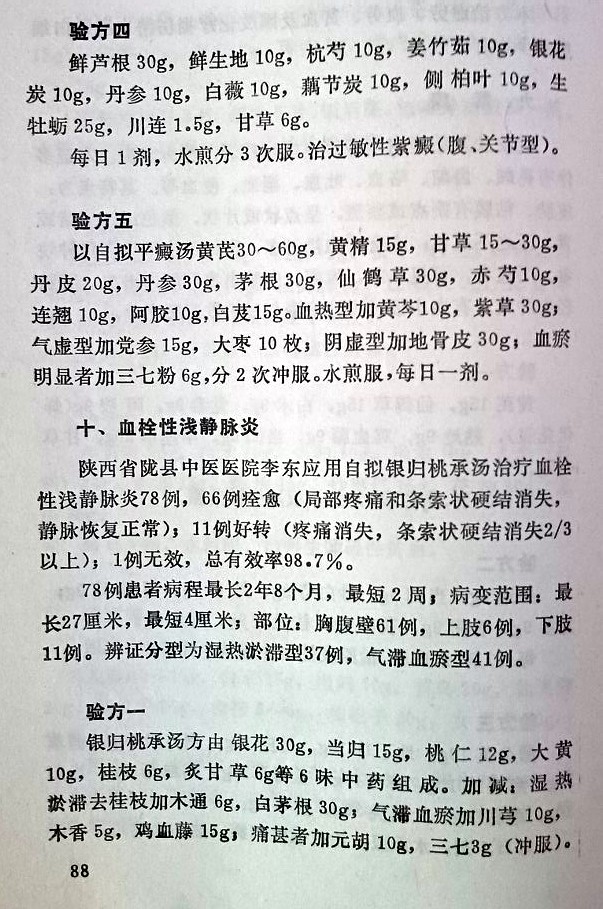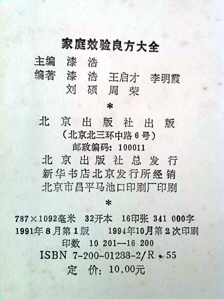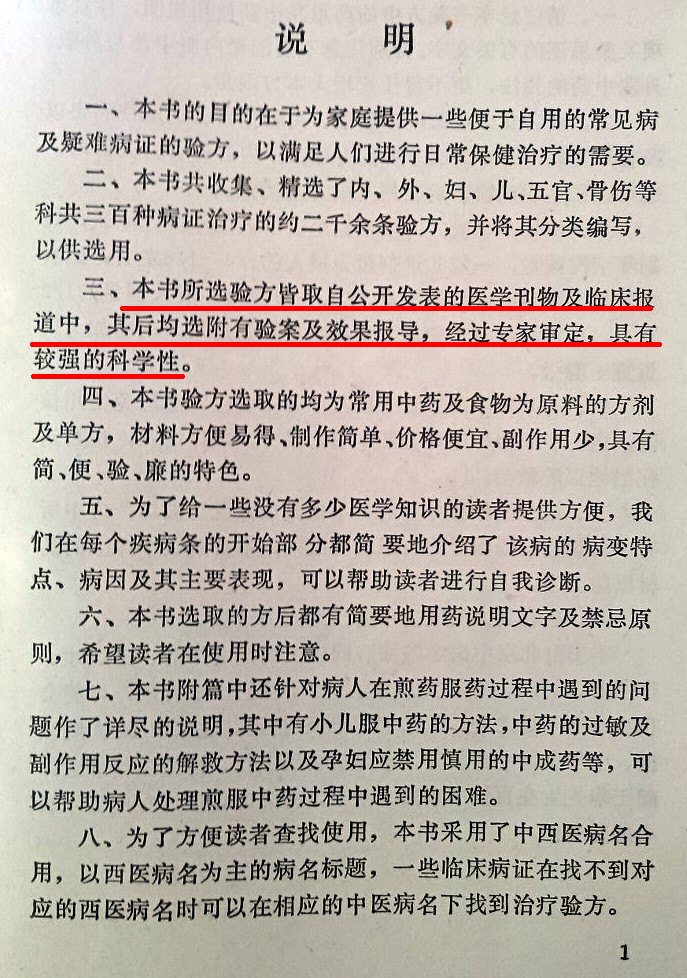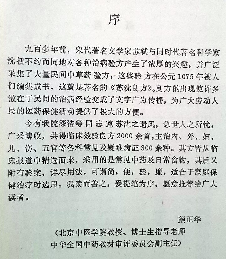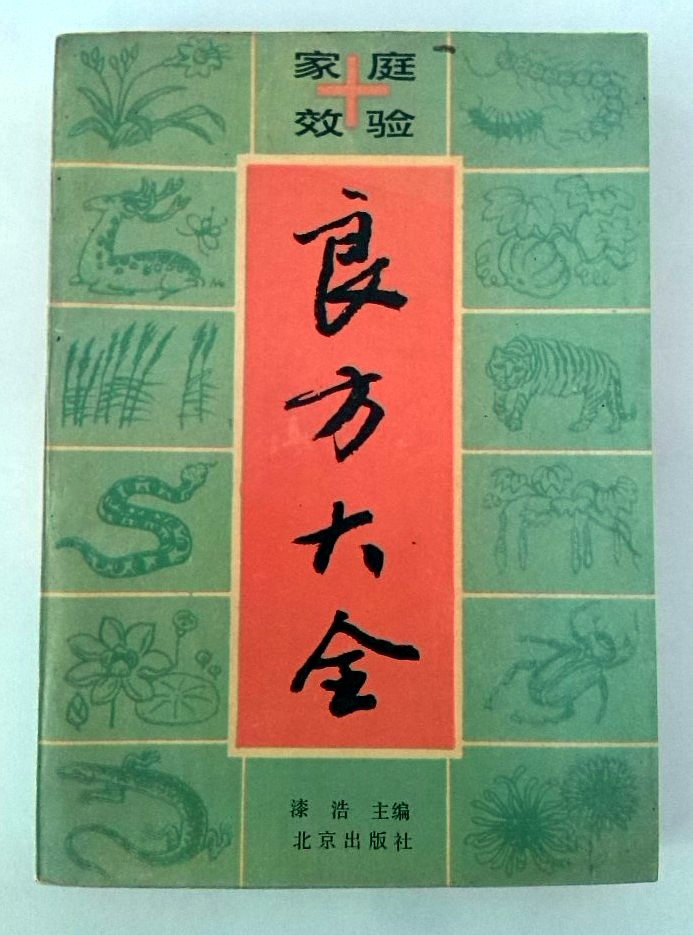 找到个资料:《家庭效验良方大全》,虽然是本“科普性质”的纸质书,是上世纪90年代初出版的,但它是北京中医药大学(1993年以前为北京中医学院)漆浩等编纂,国医大师颜正华作的序。书中所选验方均取自公开发表的医学刊物及临床报道,且经过编者审定。