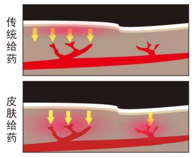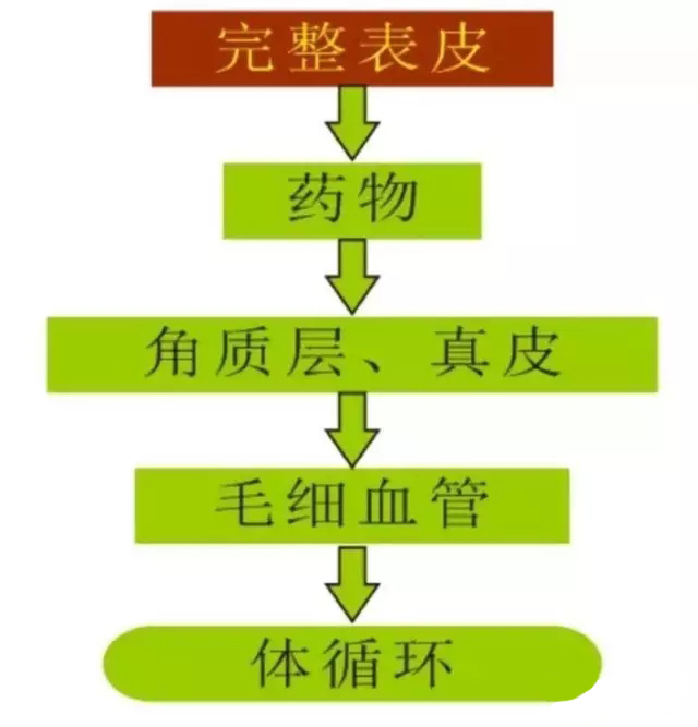 透皮贴敷技术是指皮肤角质层,通过皮肤表面的药物浓度与皮肤深层的药物浓度差,以被动扩散的方式透过角质层,再进入真皮层、毛细血管,通过体循环到达靶位起作用。此外,部分药物也可通过皮肤的毛孔和汗腺等附属器官吸收、渗透进入体内。(TAIJI 太极绿疗商学院)