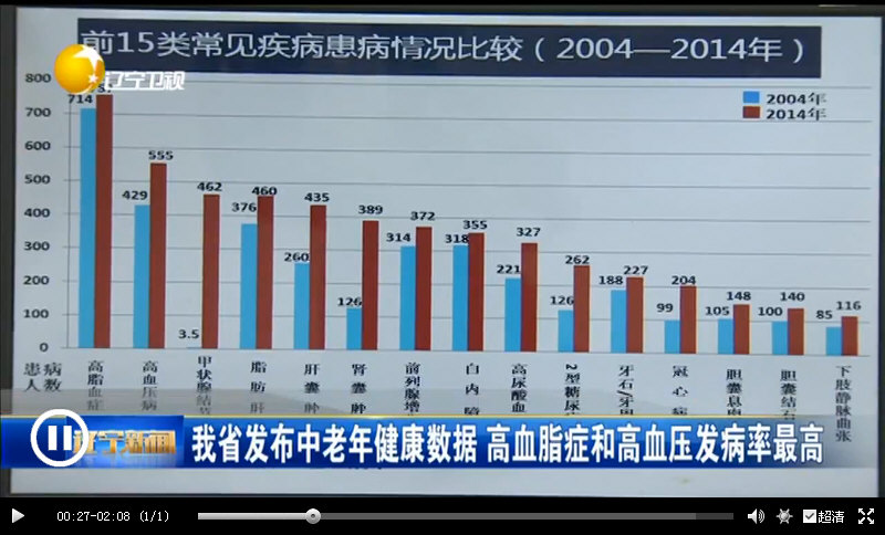 辽宁省2004-2014年间15类常见病发病率比较(冠心病、糖尿病,均翻了一番多)。