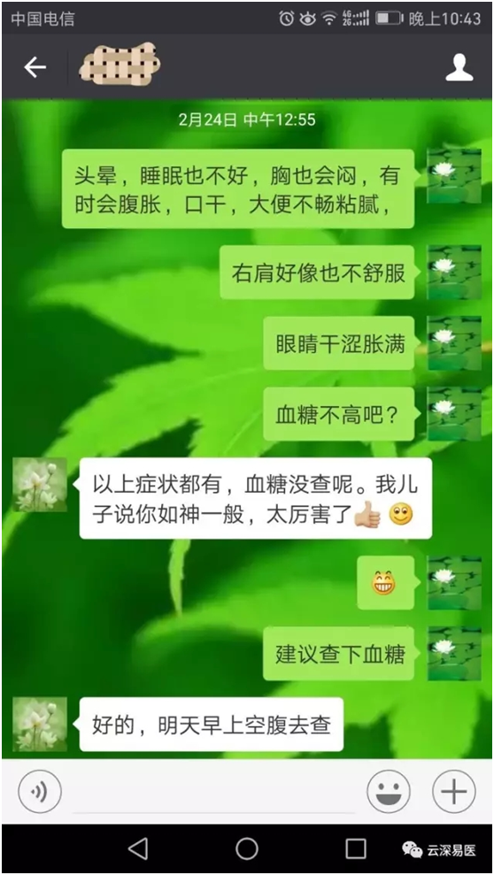 我看后回复为:头晕,睡眠不好,胸闷,有时会腹胀,口干,大便不畅粘腻,右肩不舒服,眼睛干涩胀满。并问血糖高不高?