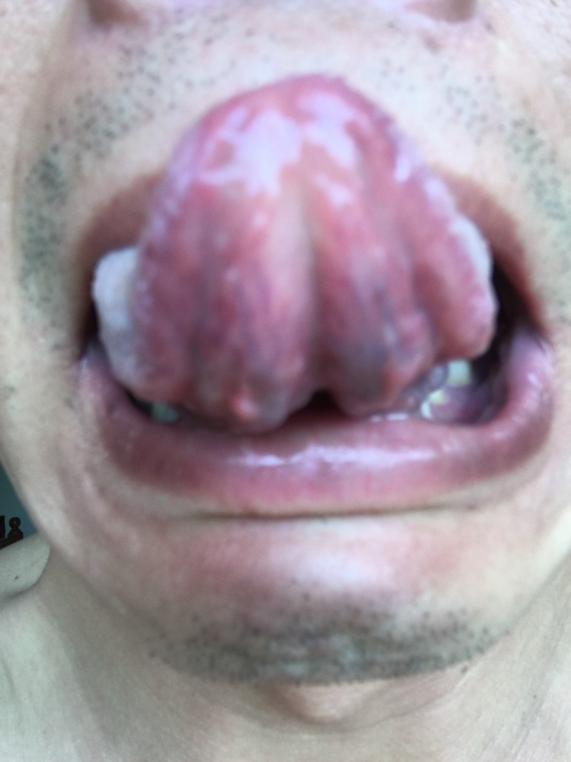 舌苔厚偏白,有裂纹。