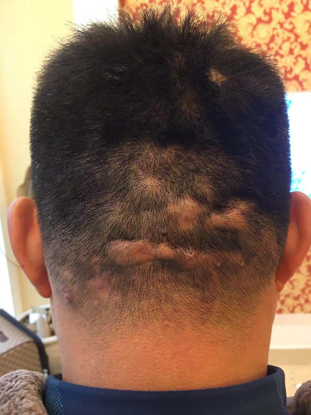 多年前头上开始长一个小疙瘩,里面有脓,疙瘩刚长出来的时候很疼很痒,疙瘩会越长越大,最大时像鸽子蛋一样,近年来疙瘩长的越来越多,夏天疙瘩就会少很多,冬天就会长的很多。脓挤出来后就会回瘪下来结痂,但是后期还会继续长出来,多方求医无果。患者皮肤油脂蛮多,面部正常,两颊下部有微微一点点痤疮样的疙瘩,大小便正常。其他无异常。