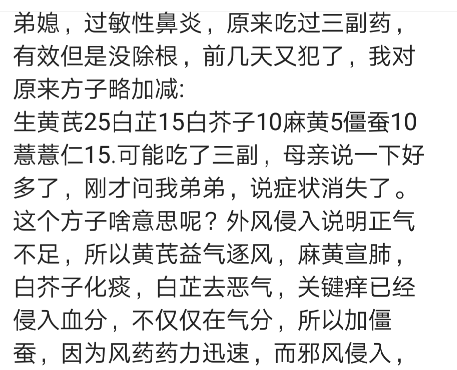 中医有异病同治,同病异治的说法,所以不能一个方子包治同一个病。黄芪虽然有利水消肿的功效,鼻痒流水那不是水肿导致,何以知之?比如,给病人用用麻黄、桂枝、细辛、白芷、苍术之类的药,鼻子是不流水了,但是本来清稀的鼻涕变成浓干的,不能流动,并且舌头会发干。桂枝加厚朴杏子汤如果不行,那么喘,气不下行,那么我原方重用黄芪是不行的啊!