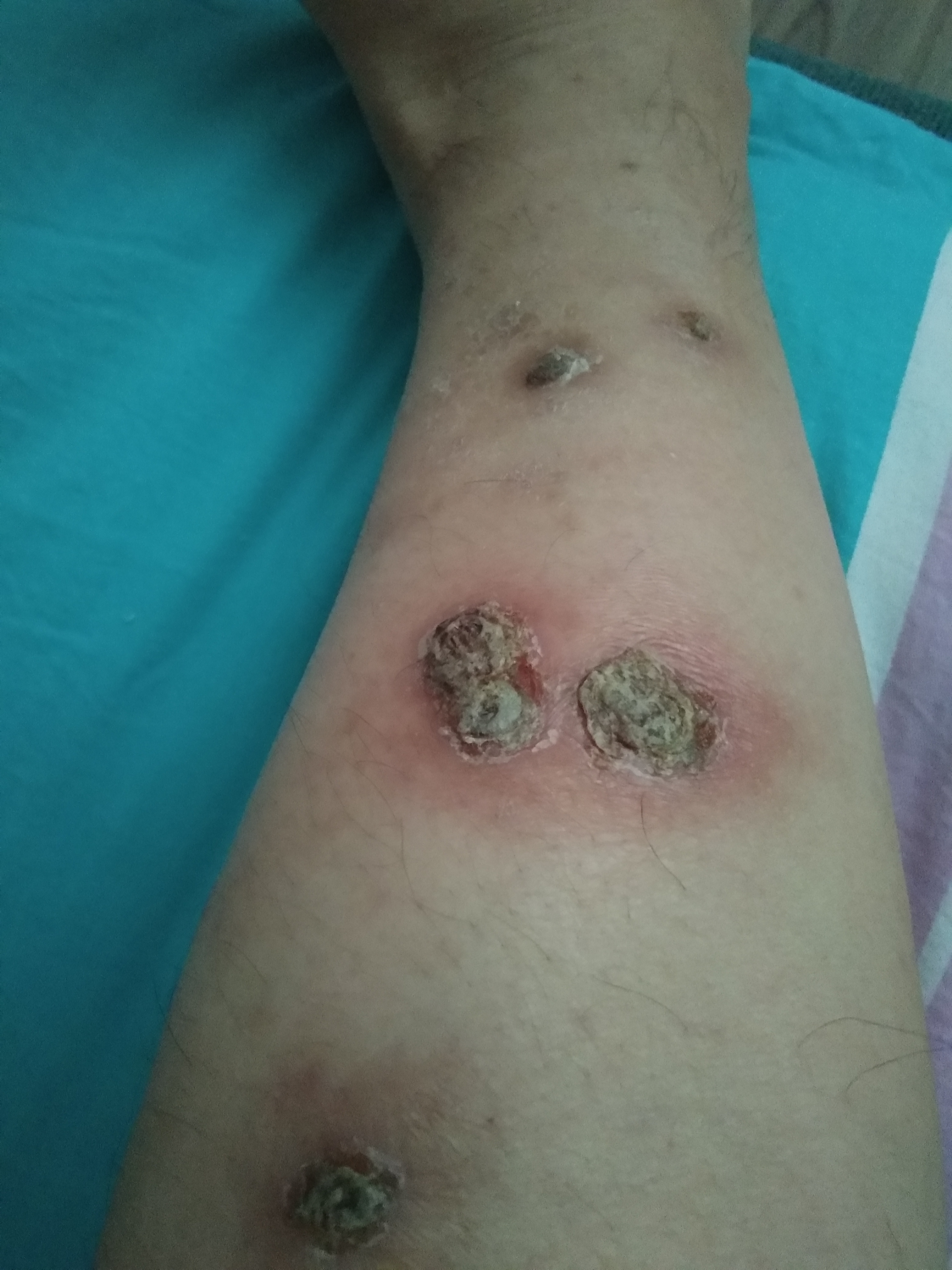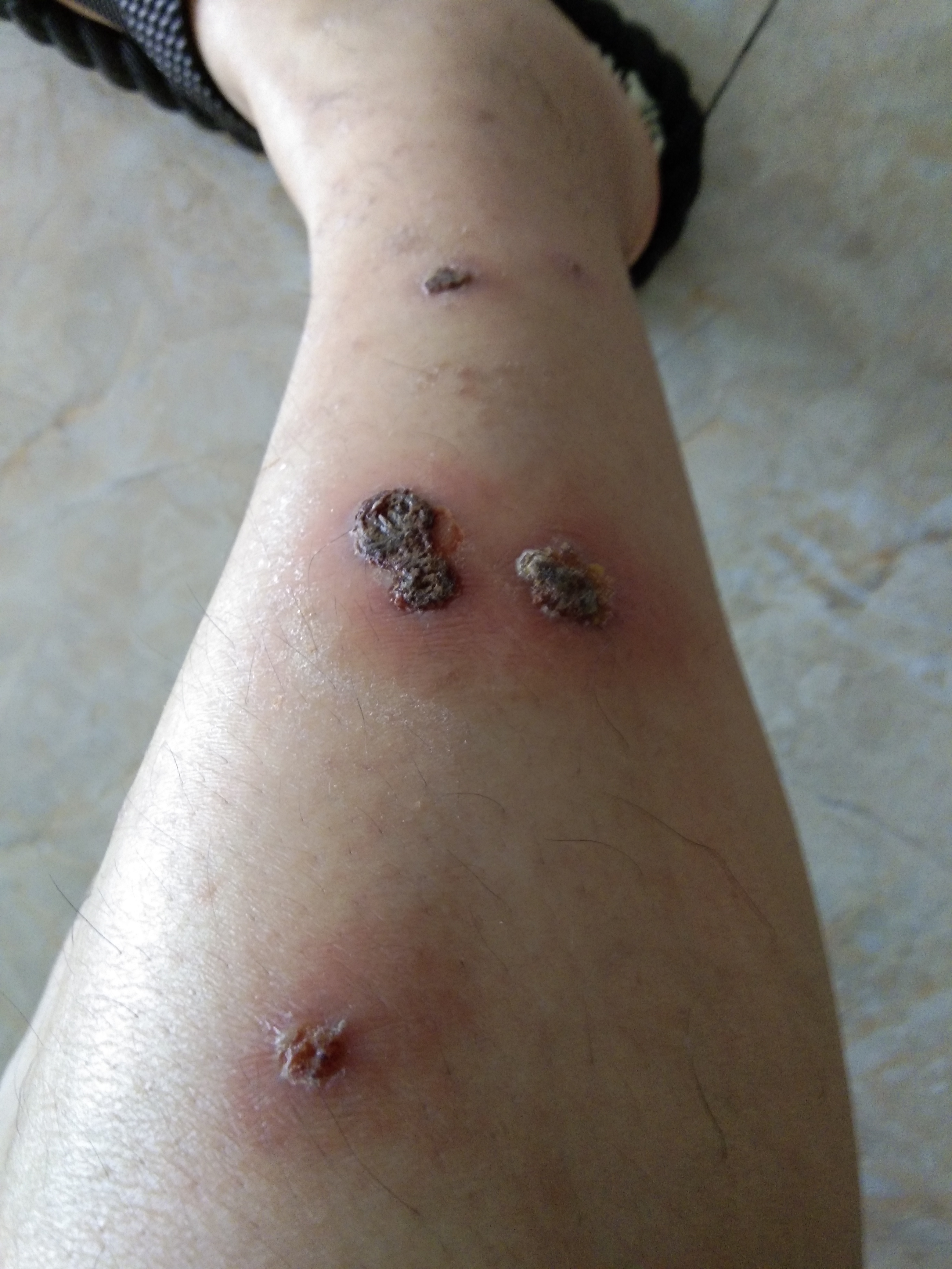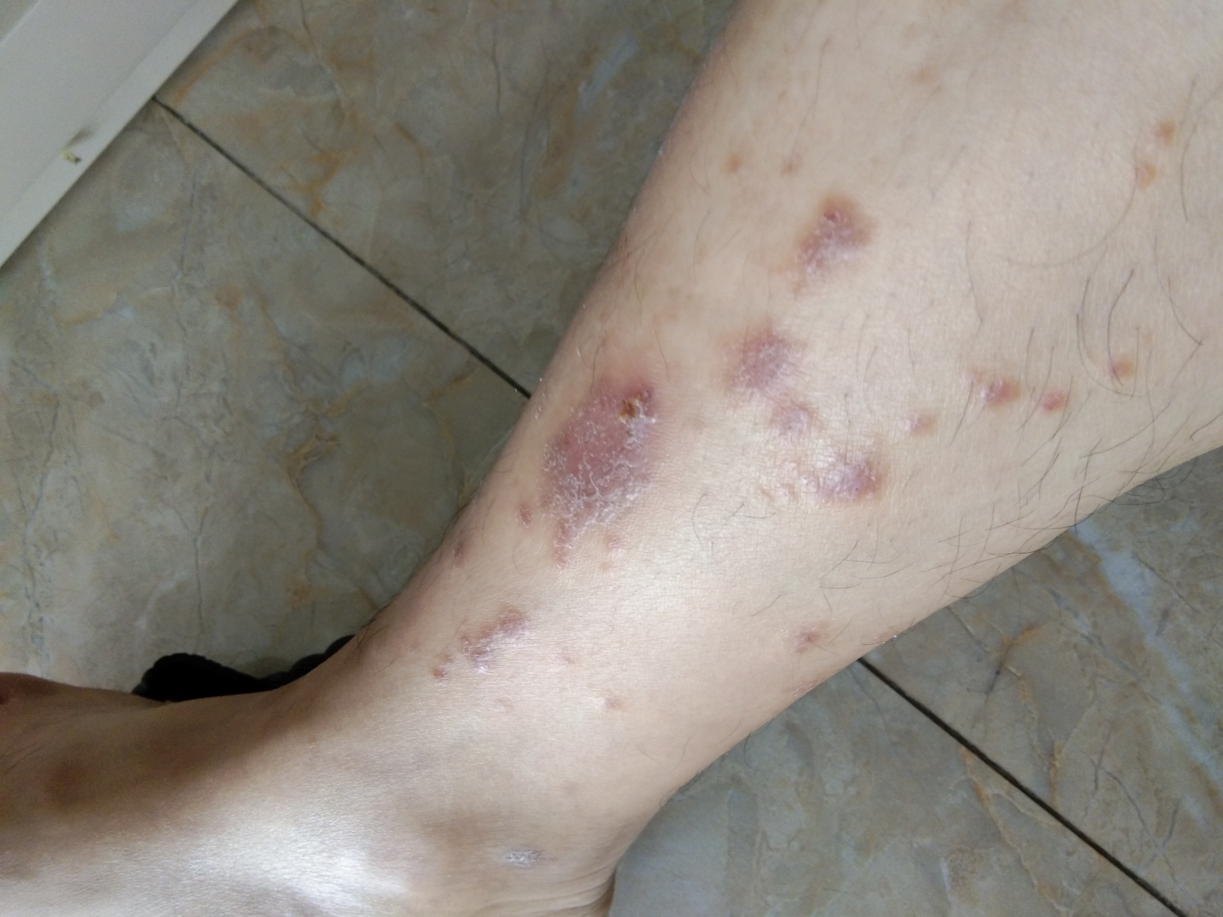 前两天晚上上夜班,右脚从踝到膝肿了,按得出坑,而且几月前脚趾3-5趾间溃烂流黄水到现在,由蚊子叮咬的点扩大为疤痕,发痒难忍,挠破了就流黄水,结痂随着破溃扩大,人口渴,想大量喝水,食欲变小,一天吃两馒头也不饿,身体乏力,体重减轻,情志上以恐慌,焦虑,忧愁,悲伤为主。