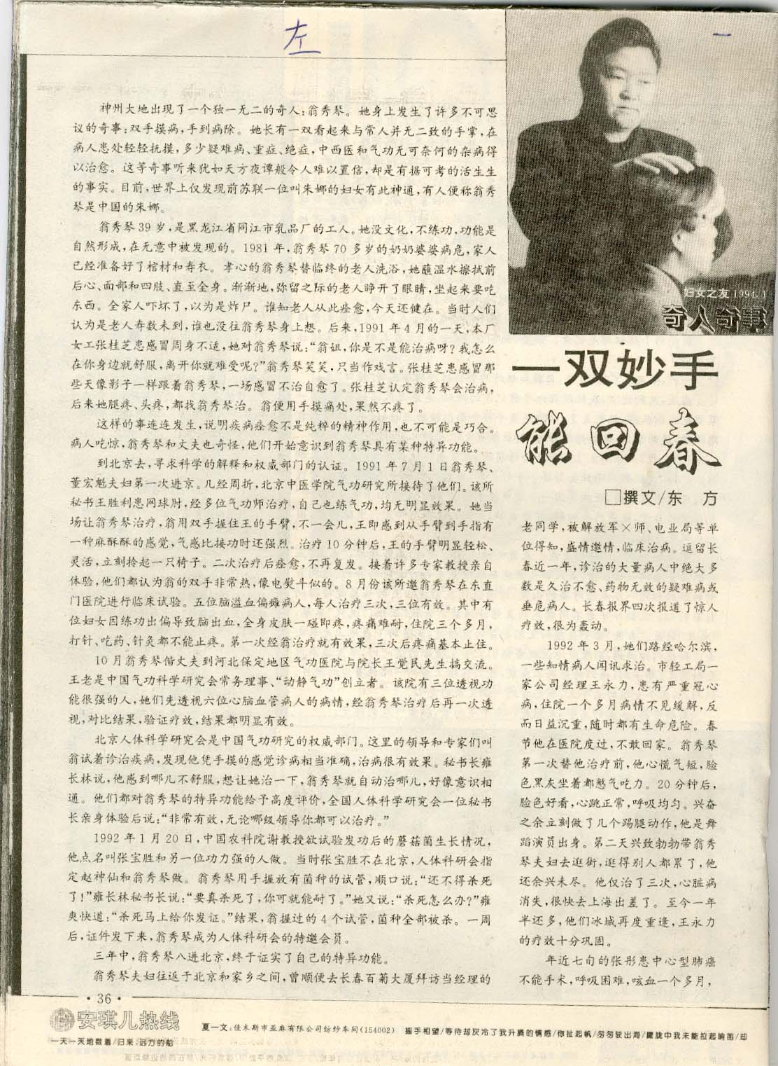 翁秀琴一九五四年出生在黑龙江省富锦市大榆树镇沙岗村。出生后三天,给她灌“风药”(当地人的一种风俗,怕小孩肚子疼),翁当时不会说话,当一岁多会说话时,讲出当时细节,把大人吓了一跳。翁从出生到二岁,每天下午三点左右无缘无故地哭,咋哄也不行,直到星星出来后才不哭。翁懂事就记得双手经常发热,特别是双手合在一起就热得发烫,脸也通红。找医生也查不出病来。二岁到五岁,翁还经常跪着走路,喜欢在水里泡着,一人多深的水里,翁漂在上面很舒服。翁六岁时,奶奶突然双目失明,翁经常给奶奶洗脸梳头,一个多月后,奶奶的眼睛不治而愈。翁小时候,夏天经常到房后小园摘沙果、摘黄瓜。她后院的老爷爷、舅爷爷在屋里看翁秀琴就象太阳似的是一团光,这光能从黄瓜架下透出来,到跟前一看是个孩子—翁秀琴。而翁的另三个姊妹同时在场则无任何异常。二老试过多次,结果都是这样。二老当时眼睛不花,能看书,且很精明,他们不敢对别人说。翁秀琴喜欢吃冰,就是冬天也经常一碗一碗吃,喜欢吃辣椒和葱蒜,但饭量比同龄孩子小。七岁那年夏天,翁在北窗台玩,一球状雷电在附近跳跃,翁伸手去抓,没抓住。球状雷电飞到北地击倒三个农民:一死二伤。从此翁的身体长的很快,十三岁时能把一百六十斤的一袋谷子从地下搬到炕上。一九八一年,翁的奶奶婆婆患肺不张,医院不留,家里准备好棺木。翁给老人擦洗前后心和四肢,渐渐地老人睁开眼睛,要吃东西,亲戚朋友都吓坏了,以为“炸尸”,谁知老人从此痊愈。九一年 四月,同江乳品厂女工张某某患感冒浑身难受。她经过比较后对翁说:“翁姐你是不是能治病呀,怎麽我浑身难受,到你身边就舒服呢!”(后来发现一哈尔滨患者在翁身边,妹妹峰房肺被治愈的同时,其定期发作的胃病不治而愈。北京京城大厦女工白杰在翁身边即感觉其子宫肌瘤在“蹦”,翁给其做了一次,子宫肌瘤消失了...... ) 翁就开玩笑似的给张“治病”,效果很好。但谁都没在意,以为是碰巧或精神作用。后来治的人多了,象冠心病、肺心病等重病,效果都非同一般地好。同江三中有位女老师,吃东西、喝水食道都疼,翁只用一次便使其痊愈......。因翁秀琴能使大量效果重复出现,她和效果之间有因果关系。绝不能再用碰巧和精神作用解释。为搞清其中原因,翁和爱人来到北京。