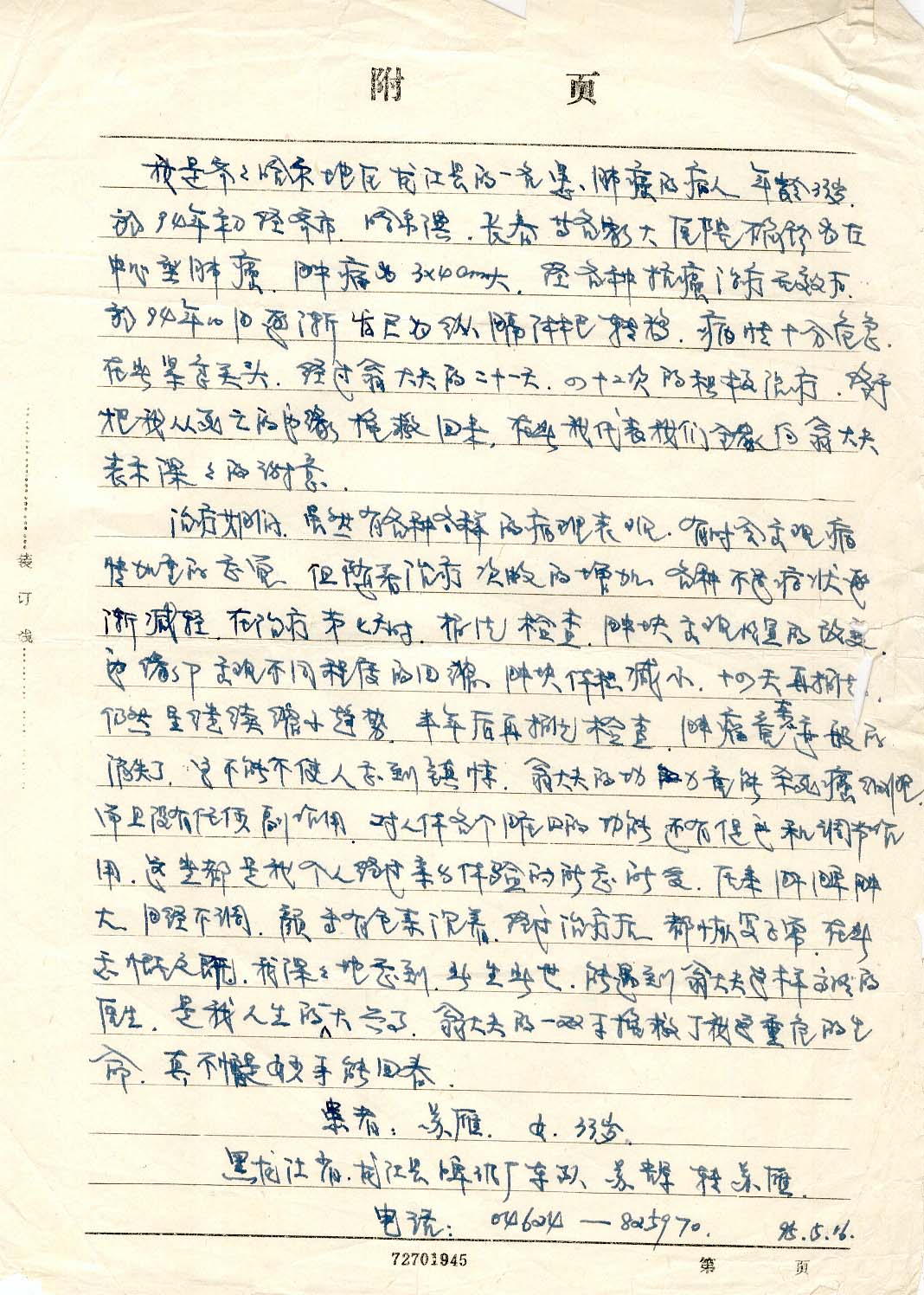 九二年,在北京鼓楼东大街小经厂甲十八号院,孙凤茹患心脏供血不足,三天两头去北京医院抢救。经翁三次治疗(治完孙感觉象脚踩棉花团似的),至今二十多年,一直很好。空军军校部副部长、架机起义的黄植诚,其母自台湾来看他,发现肺癌,住空军总医院,坐轮椅下的四楼。经翁一次治疗后,即自己走上四楼。黄母叫黄和他姐姐给翁跪下,请求为她治病。翁和爱人退掉回家的火车票,黄把翁安排到空军羊坊店干休所,去黄家为其母治病。头三次病情明显减轻,第四次开始,黄母有强烈反应。由于翁当时没治好过一例癌症,心里没底,只好借故推手。现在想起来,真是可惜了。后来诸多癌症患者在被翁秀琴治愈的过程中都经过强烈的、各种各样的反应。这是必须的。是康复过程当中的必然现象,是好事,而不是坏事。试想:既然多次实践证实能克制、搬动它,又怎麽会突然不能了呢?得病有过程,康复也有过程, 且不是一条直线。