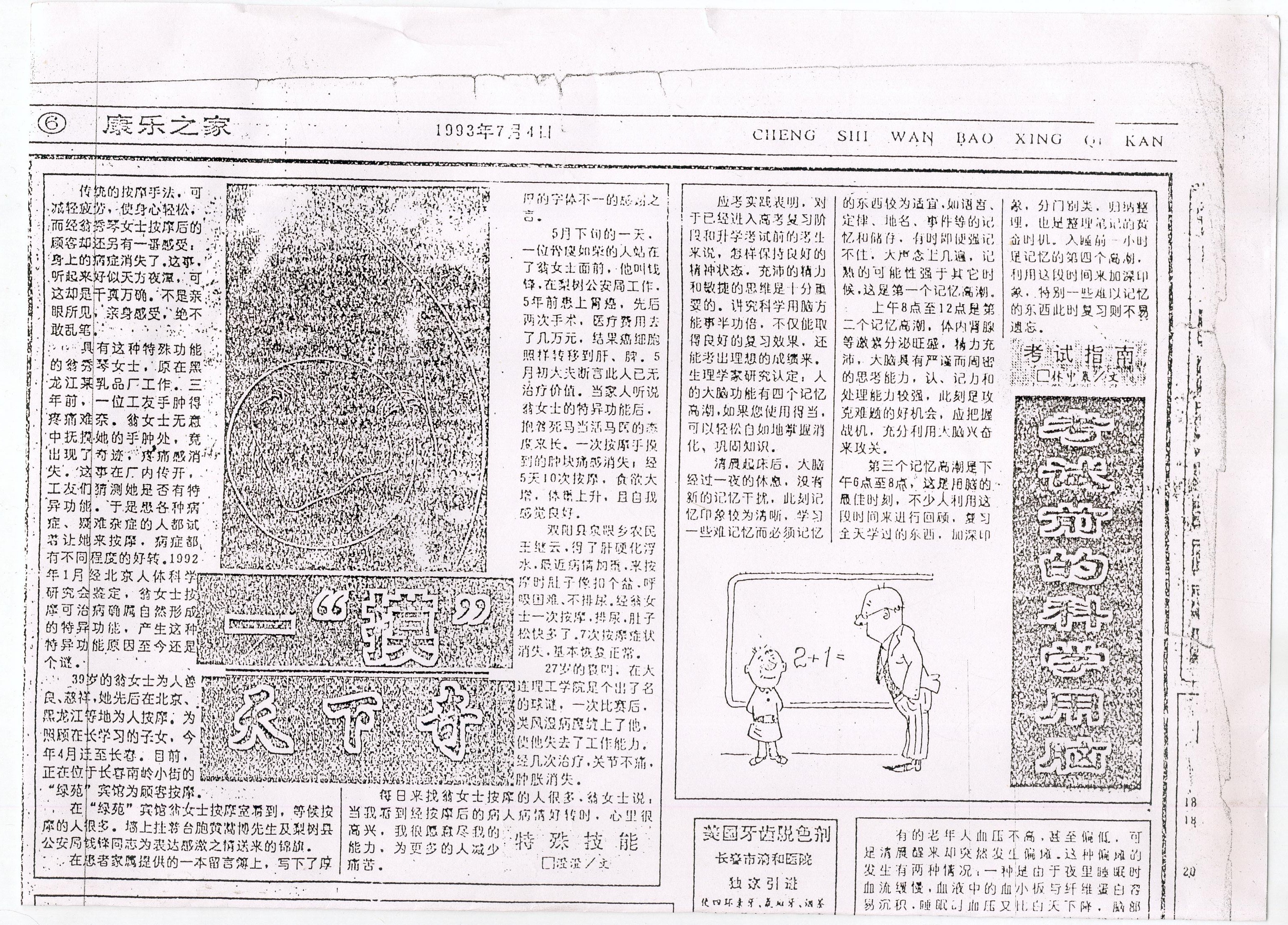 九二年冬在长春市百菊大厦,举行了有二十余名记者参加的记者招待会,有一女患者脖子后长一脂肪瘤。先经各位记者检查确认大小。翁发功后,瘤子当场小了一半儿。《长春晚报》新闻部杨主任说:我现在头有点儿疼,我知道在什麽位置,他要翁指出他头疼的位置。翁摸了一会,然后指出的位置就是杨主任头疼的地方。喝酒时,本来是低度酒,也喝了两杯了,但当杨主任喝了翁秀琴发过功的酒把脸都呛红了,他说:“这酒咋这麽辣呢!”除了还有一名女记者也说这酒更辣了外,其他人都说这酒味儿变淡了。一致的是:所有的人都说翁秀琴发功使酒味改变了。九二年十二月三十日《长春晚报》以“翁女士小传”为题,介绍了翁秀琴治愈长春市宽城区牟延文肾病综合症和吉林省农安县财政局吴坤怪病(大喊、跺脚)的情况;九三年二月二十日《长春晚报》以“神奇一双手”为题介绍了翁秀琴治愈白癜风、心脏病的惊人效果;九三年五月二十一日《城市晚报》(吉林日报社出版)以“特殊的医生”为题介绍了翁秀琴治愈肺癌和颈椎间盘突出的情况;九三年七月四日《城市晚报》以“一摸天下奇”为题介绍了翁秀琴治疗胃癌、肝腹水、类风湿的神奇效果;九四年第一期《妇女之友》以“一双妙手能回春”为题介绍了翁秀琴治愈脑瘤、心脏病等及功能发现的一些情况;九五年一月七日《黑龙江晨报》以“神奇的医生”为题刊登翁秀琴的有关报道;《三江晚报》九五年二月八日也刊登了有关翁秀琴的报道。