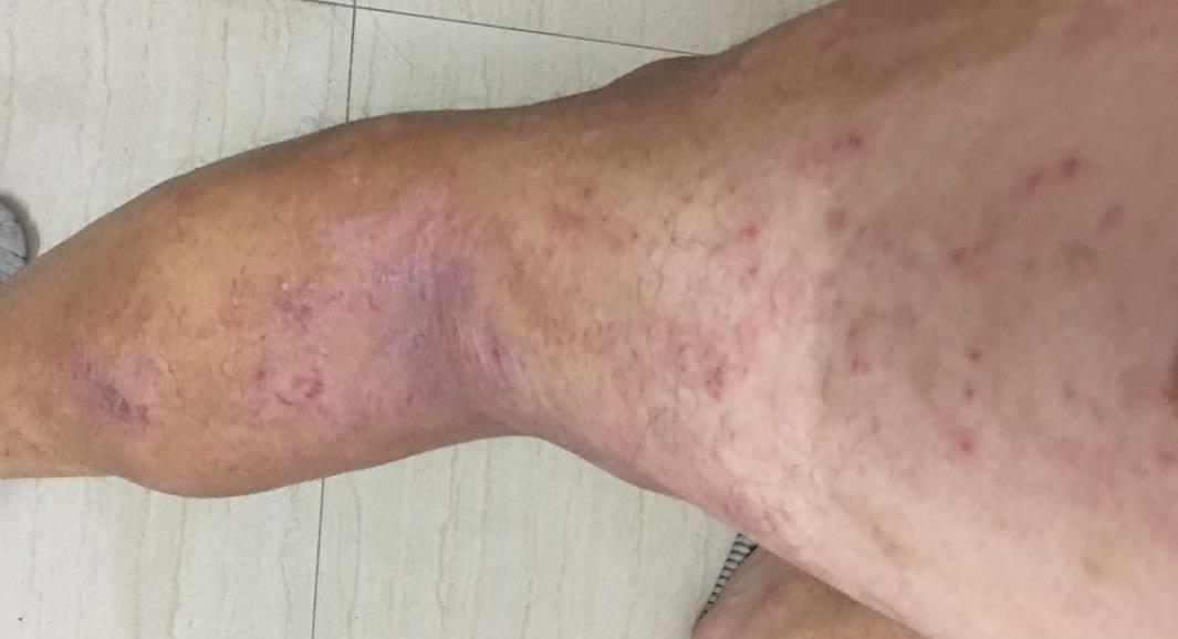 脖子上疹子消下去了,但是腿上恢复好的又开始复发,连带手臂上 腹部 背上都发了