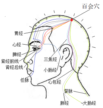 倪海厦老师说:两个耳朵耳尖的地方往上到头顶中心点,再往后五分的地方有一个凹洞,凹洞可以摸到,这就是百会。