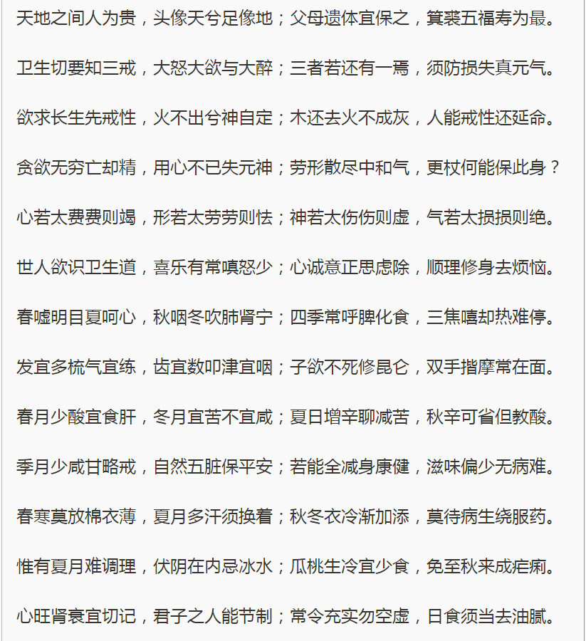 世人欲识卫生道,喜乐有常嗔怒少,心诚意正思虑除,顺理修身去烦恼.