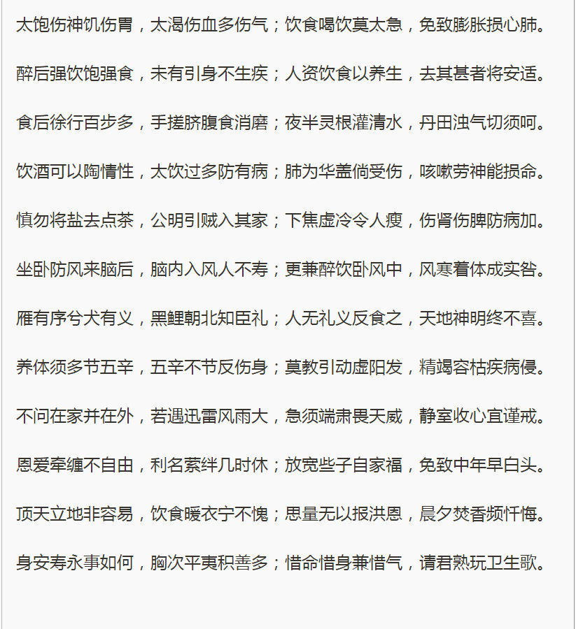 太饱伤神饥伤胃,大渴伤血并伤气,饥餐渴饮勿太过,免致膨脝伤心肺.