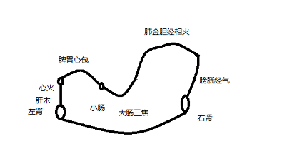 这是我们以前讲过的人体相火热量巡行的通路管道,就是脾胃巡行心包相火、大肠巡行三焦相火、肺金沉降胆经相火于腠理顺降再由表之膀胱真水配合封藏于表。相火者,疏泄外散之力也。以上的脾胃、大肠、肺金此三段生理,大家看出来没有呢?其实这三段是相通的,即胃和大肠均属阳明,且解剖位置相通,胃家也。大肠府又和肺金是相表里,此亦是相通,所以从生理道理上讲,太阳和人体的相火势力方向都是向外的,只不过是太阳的相火外散是一步到位的,而人体的相火外散是土行和金行的相互配合的上下升降。以上人体的相火外泄的通路都是土行和金行性质兼具的脏腑,所以本人称之为“土金管道”,此土金管道于人体是极其重要的,因为她是人体相火外泄之通道,此平衡人体内部能量的关键之一。这回大家知道了吧,为何本人在以上五篇文章之中一再的强调胃肠火热的问题了吧!就是为了给大家一个深刻的印象,让大家知道土金管道的重要性!人体的十二个脏腑除去“土金管道”,就剩下左肾、右肾、肝木及心火,那我们来看看下张图。