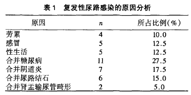 女性尿道短而宽,加上尿道口与阴道口靠近,故易发生尿路感染。本组40例复发性尿路感染患者皆为女性。尿路感染尽管在临床中很容易治愈,但由于感冒、劳累等原因致使患者抵抗力下降、泌尿系统解剖异常(如肾盂输尿管畸形)、合并其他全身系统性疾病如糖尿病以及细菌耐药等多种因素很容易造成复发。也有部分患者因短期的临床治疗后泌尿系统症状明显改善,复检尿常规正常而忽视巩固疗效,进而成为慢性带菌者,在停止治疗或机体抵抗力下降时可再次发病,尿路感染反复发作,严重影响患者的生活质量和心理状况。