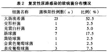2.2 复发性尿路感染的致病菌分布情况 大肠埃希菌是复发性尿路感染的主要致病菌(52.5%),其次为肠球菌(17.5%,表2)。