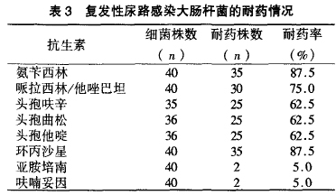2.3 复发性尿路感染大肠杆茵的耐药情况大肠杆菌对氨苄西林及头孢和喹诺酮类抗生素耐药率较高(62.5%-87.5%,表3)。