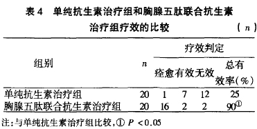 2.5 不良反应 胸腺五肽联合抗生素治疗组20例患者中仅1例患者主诉头晕,余无不适主诉。疗程结束及治疗后半年复查血常规、肝肾功及心电图均正常。