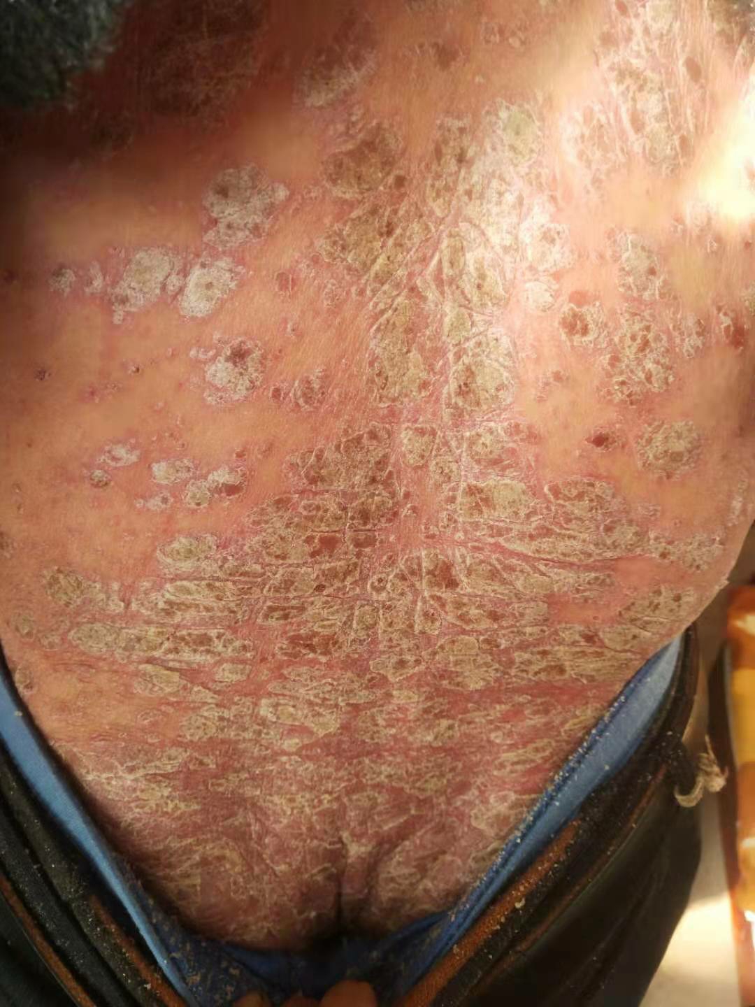 全身长满红斑块子,,奇痒无比,晚上更痒,受大刑似的,一夜望不到天亮。家庭条件甚好,孩子们孝心,武汉郑州都去了,久治不好。最后经吴城街亲戚介绍来用中药治疗。他说就象死了一次,一直认为活不成了,今天终于治好了。