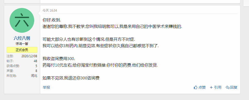 六经八纲 声名鹊起 正式会员 注册 2020/12/08 帖子 813 获得点赞 122 声望 43 所在地 大陆以外 2021/05/01 #5 首先,西医不要来套药方,你们赚的够多了.又不研究医学.一知半解还容易误导别人. 再次有些西医不认同我说的还来气报复,我说过,用西药的中医是没有学到位.明明在自己身上见到奇效了,非要再改口.后面的方子恐怕你问遍全国你也找不出来. 第三我们不反对 西医的外伤急救. 因为黄帝外经已经失传了.我们不能指望段时间内赶上.因为我们不知道自己失去了什么.失去的文化有多强大.