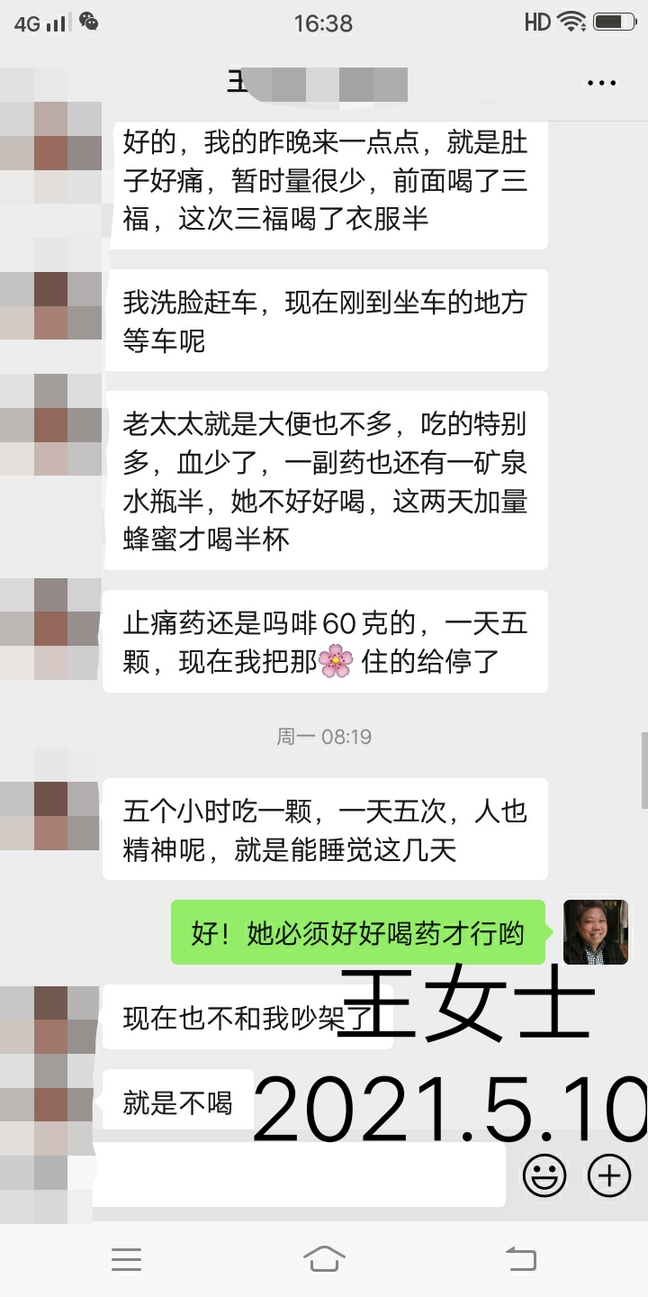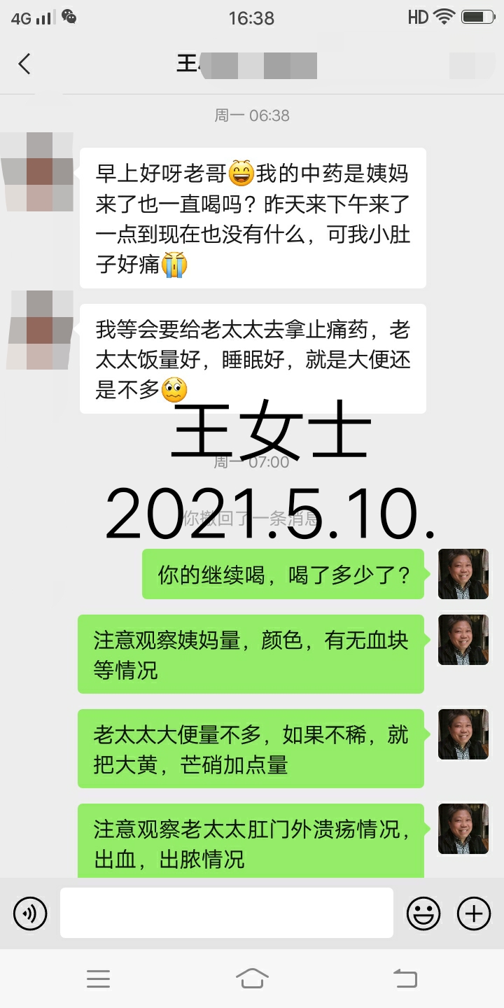 2021.5.10.王女士 早上好呀!老哥,我的中药是姨妈来了也一直喝吗?昨天下午来了一点到现在也没有什么,可我小肚子好痛。