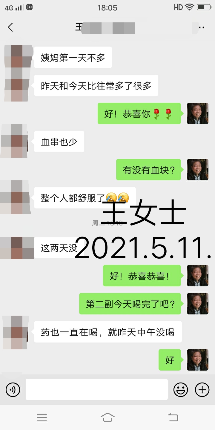 2021.5.11.王女士 姨妈第一天不多,昨天和今天比往常多了很多,血串也少,整个人都舒服了。