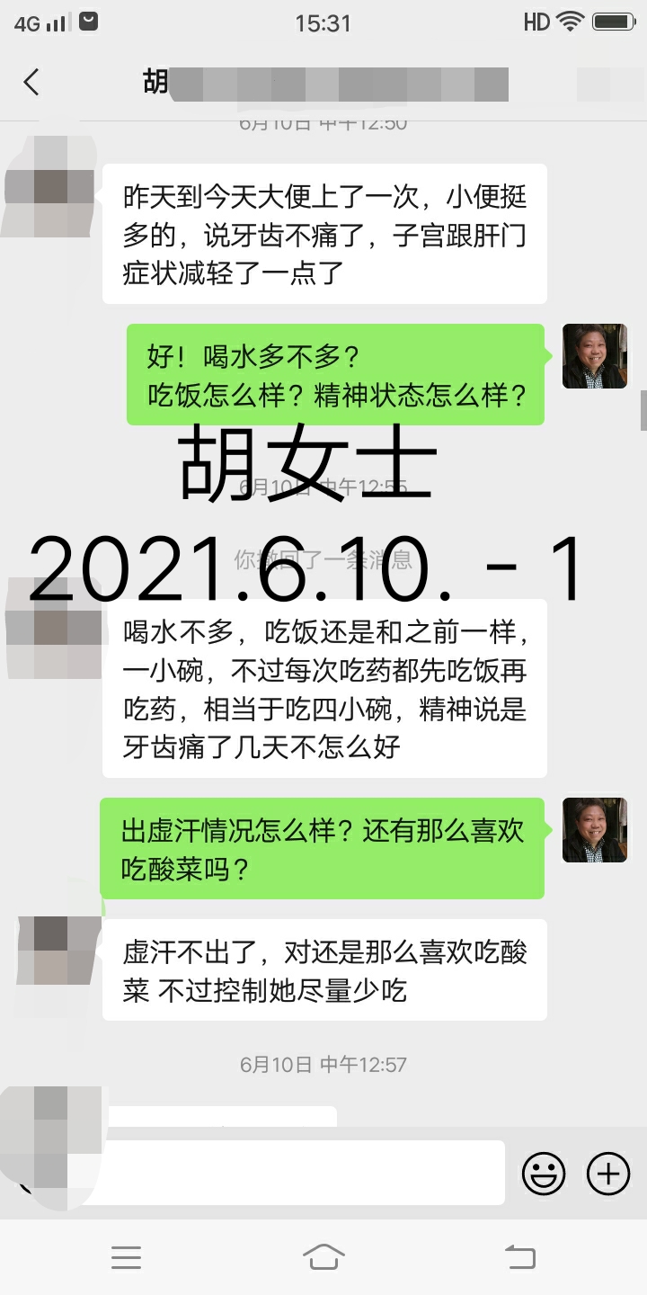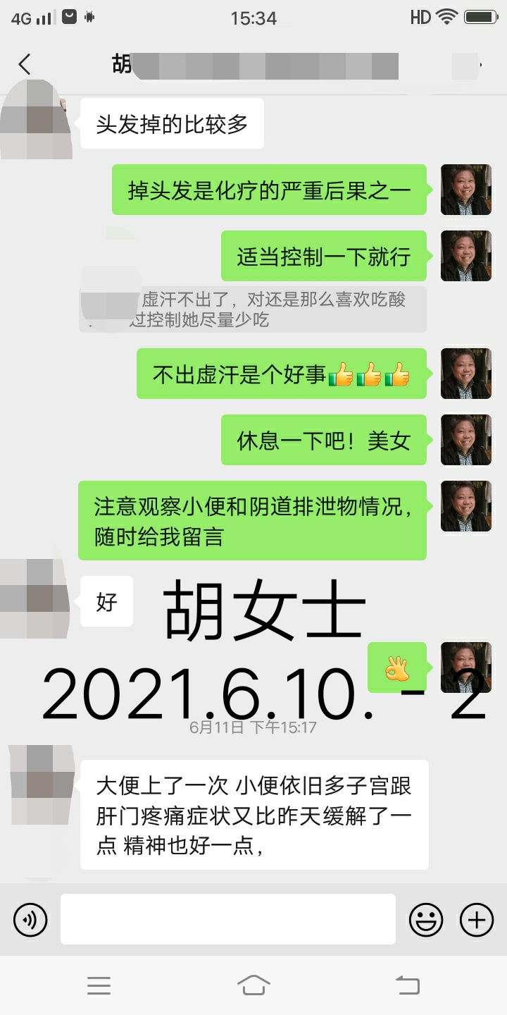 胡女士 56岁 云南省玉溪市人,患宫颈癌,膀胱癌,住院检查治疗期间,其姨侄女知道我治疗肿瘤方面有一些经验,于是联系我请予治疗。