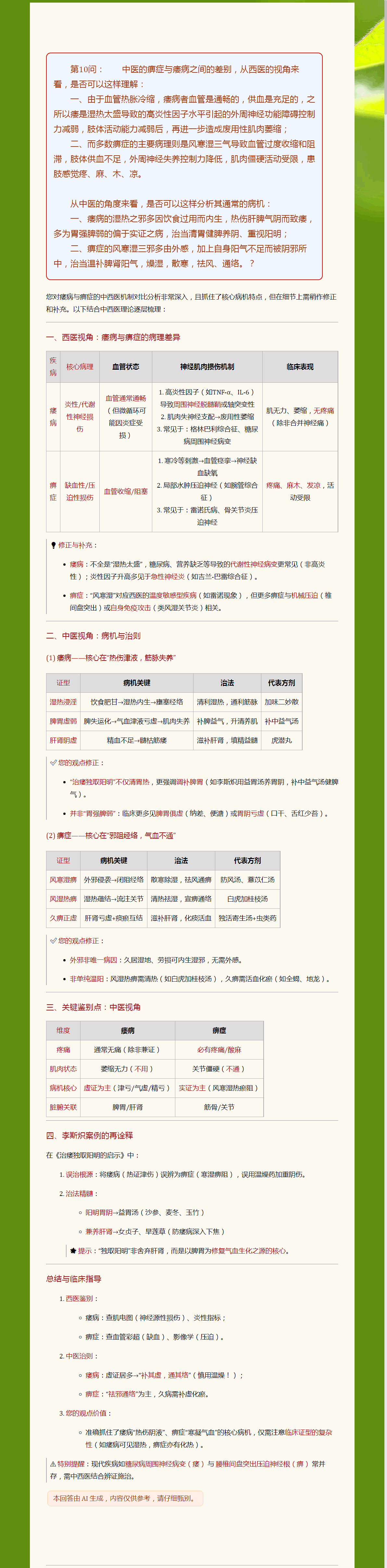 梦回杏林 闻名全坛 核心会员 注册 2013/11/15 帖子 19014 获得点赞 12165 声望 113 所在地 2025/07/11 #21 痿病特点是:萎软纵弛温、多风湿热邪为患 痹症特点是:疼麻木凉僵、多风寒湿邪为患 附件 痹症与痿病之间的差别.png 264.9 KB 查看: 39