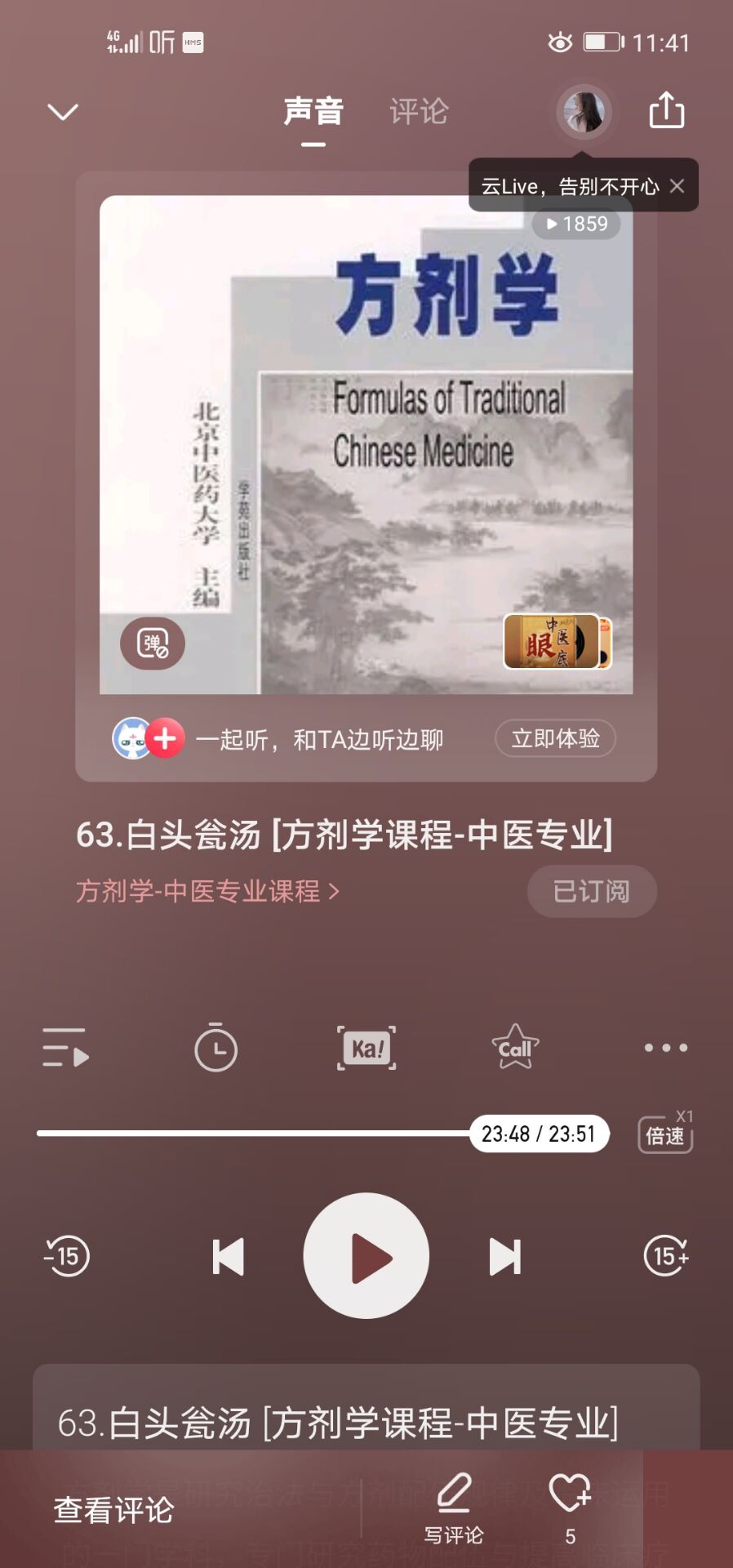 今天又听了下喜玛拉雅,我附件这一版的《方剂学课程-中医专业》,63.白头翁汤,第21分钟18秒,讲了一个医案,某一35岁女士,一开始腹泻便秘交替出现,迁延年余,目前腹泻每天三次,便脓血,少腹痛,伴有里急后重,苔白腻而干,脉象弦小,更偏于湿热性质,西医诊断为慢性肠炎,中医辨证为湿热蕴阻肠间,下焦气机不利。白头翁汤去黄柏,加木香、当归、赤芍,(实为白头翁汤合芍药汤加减),吃后好转,便脓血改善。后用两个小方子收尾,桂枝汤(调阳阳),香连丸(清热去湿+调气)。