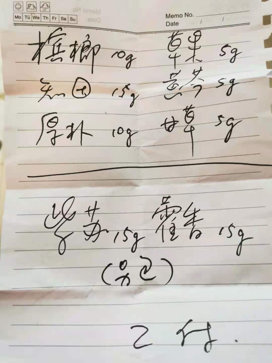 处方:槟榔 10 草果5 知母15 黄芩5 厚朴10 甘草5 另包:藿香 15 紫苏15。单位:克。2副。