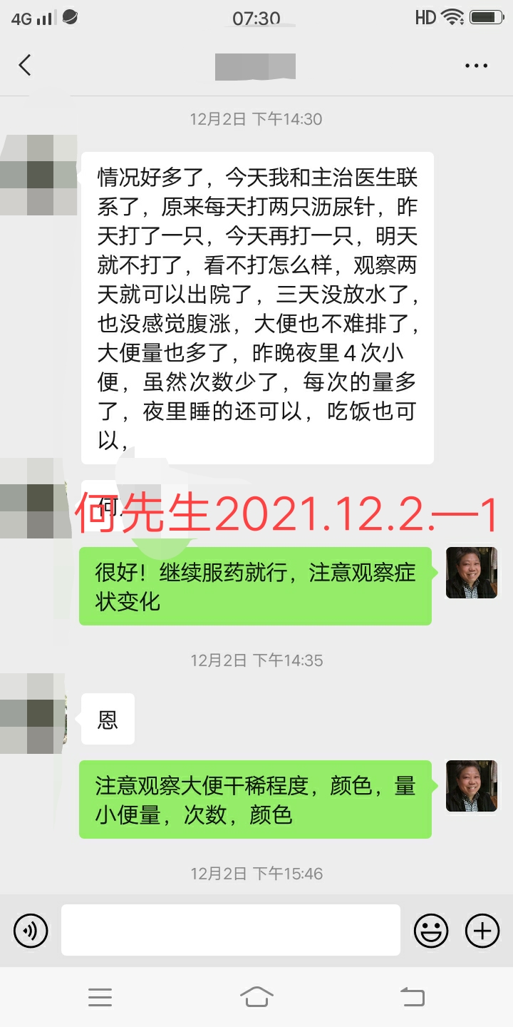 2021.12.2.中间人(转发) 情况好多了,今天我和主治医生联系了,原来每天打两只沥尿针,昨天打了一只,今天再打一只,明天就不打了,看不打怎么样,观察两天就可以出院了,三天没放水了,也没感觉腹涨,大便也不难排了,大便量也多了,昨晚夜里4次小便,虽然次数少了,每次的量多了,夜里睡的还可以,吃饭也可以。