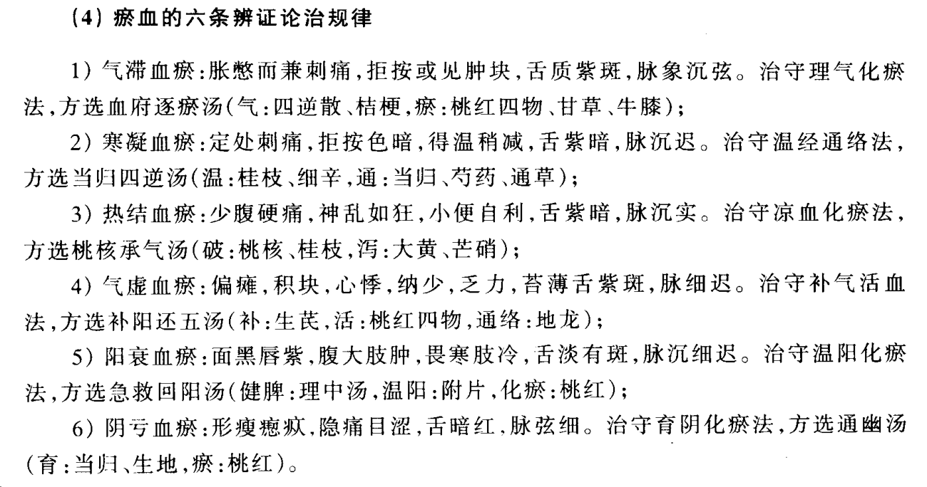 梦回杏林 闻名全坛 核心会员 注册 2013/11/15 帖子 18917 获得点赞 12050 声望 113 所在地 2023/03/02 #429 goldharp 说: 浏览附件128686 点击展开... 不止六条,还有两种常见的瘀血证候,第二条尤其普遍: 一、血虚血瘀证 [四物汤](《太平惠民和剂局方》) 熟地、当归、白芍、川芎 二、痰阻血瘀证(痰瘀互结证) [双合汤](《万病回春》、《杂病源流犀烛》) 桃仁、红花、当归、川芎、芍药、地黄、陈皮、半夏、茯苓、白芥子、甘草