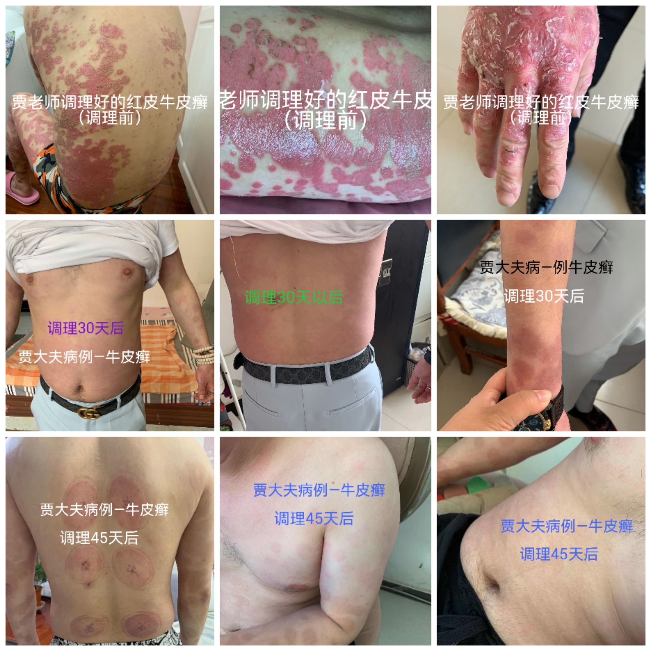对于火毒比较盛的红皮牛皮癣,需要重用滋阴降火药,比如金银花、玄参、丹参、牡丹皮、玉竹、黄精等,大便秘结的加一点大黄,还要重用用补气药和去风湿药,如生黄芪、白术、威灵仙等,对于皮肤干燥掉皮的,加一些柏子仁、酸枣仁等。下面图片这个病例,调理45天后完全痊愈,回访,至今未复发。