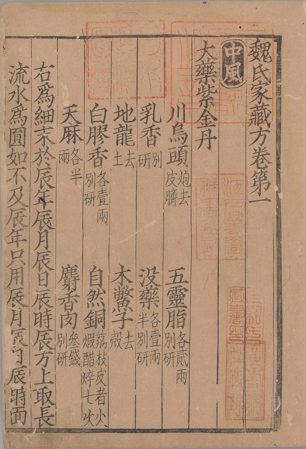 此书系魏岘综合他的祖父、父亲和他本人三代的医方所编撰而成,故名《魏氏家藏方》。此书国内无传本,日本藏有宋刻本。此本在汉籍流布史上具有典型的意义。卷内有「普門院印」,此普门院为中世时代京都东福寺开山之祖圣一国师从中国求法归来后所居之处。今卷一末尚有手写和歌一首,意谓 “时已秋暮,六十至矣;譬如夕阳,自矜自爱”。此首和歌的作者知家,为藤原显家之子,著名的歌人。重要的是,此首和歌书写的笔迹,经鉴定与普门院宝什库中圣一国师数通真迹一致,可推为圣一国师亲笔,则此本《魏氏家藏方》当为圣一国师入宋问法之时,从中国直接赍归,并藏于普门院的。卷中又有「多紀氏藏書印」及「江戶醫學藏書之印」等印记,则此本于江户时代归于丹波氏家族,再转入江户医学馆,最后入藏宫内厅。